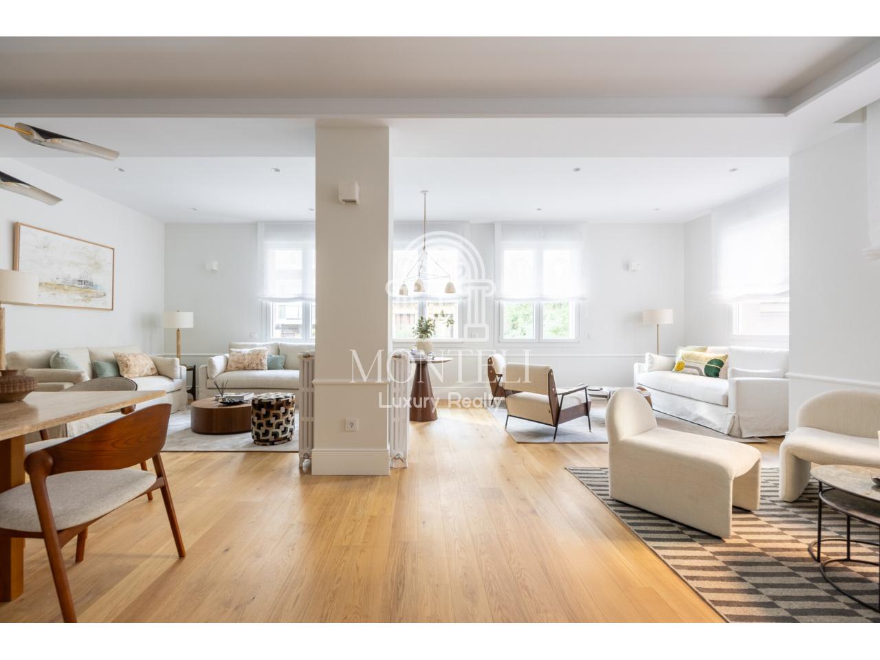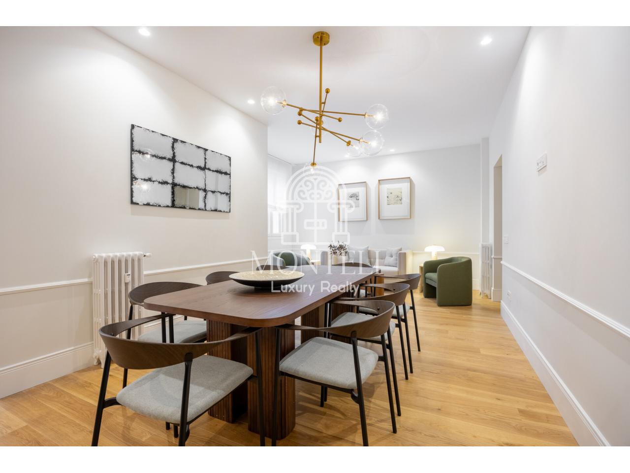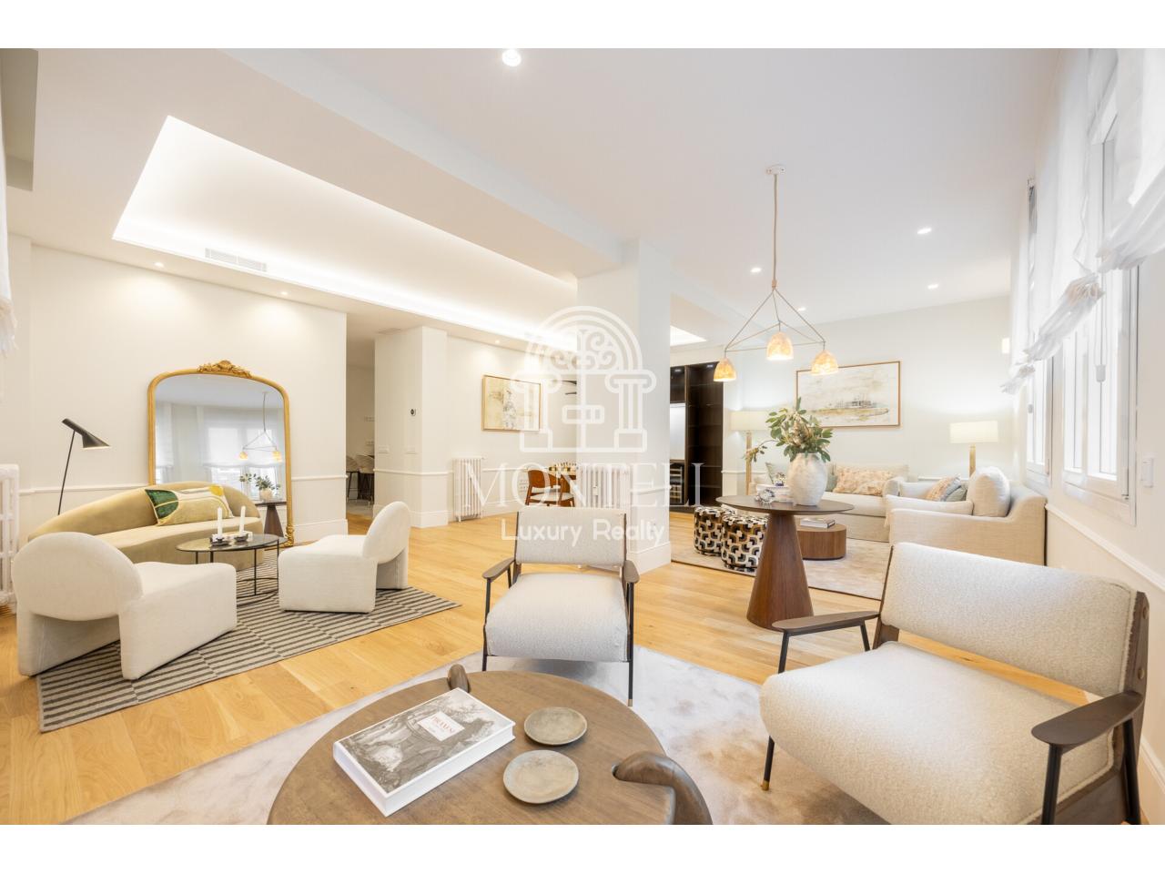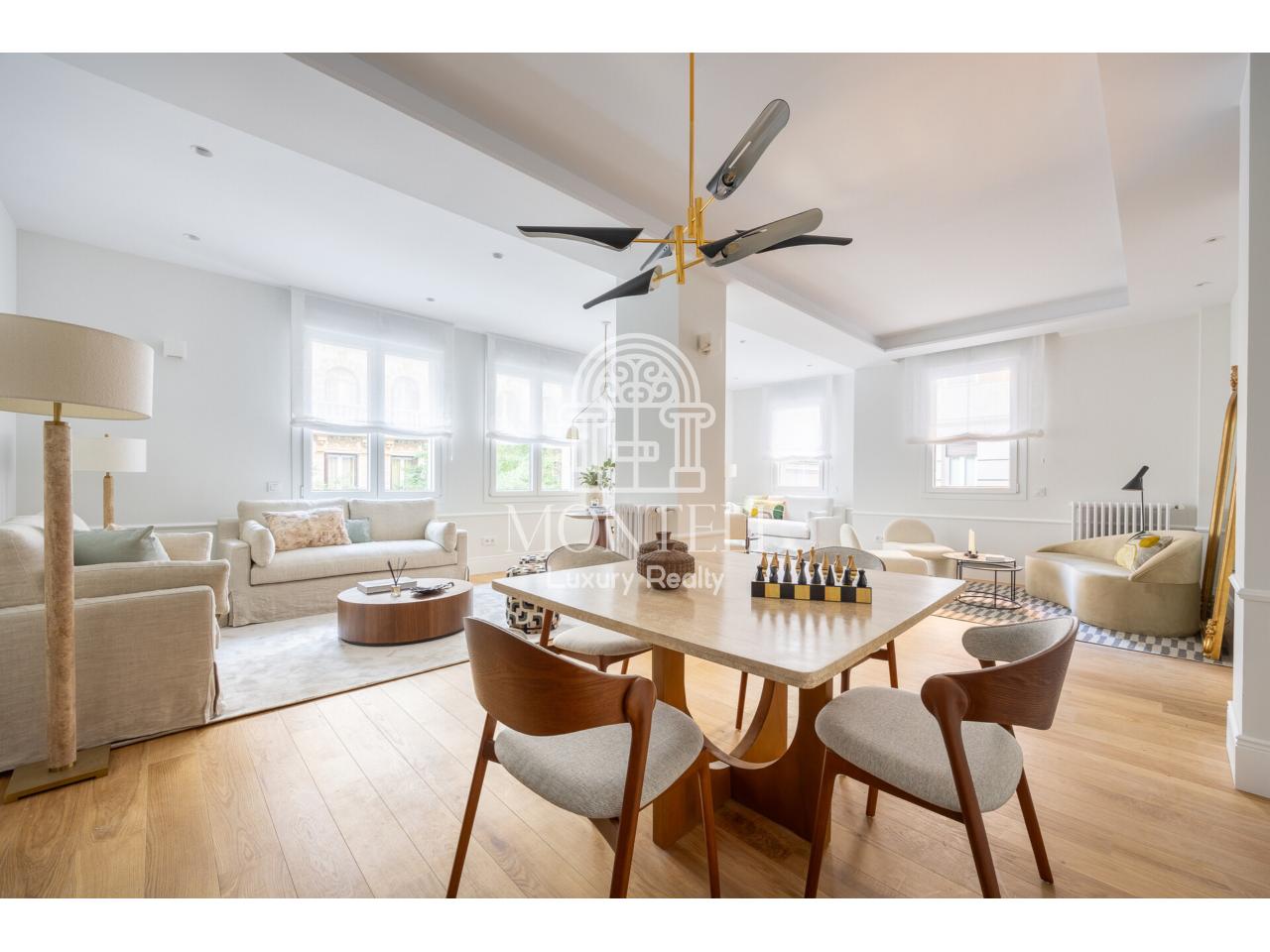 El piso, integralmente reformado de diseño, cuenta con 251 metros cuadrados y es muy luminoso por sus 9 ventanas a la arbolada calle Don Ramón de la Cruz con orientación sur. Está distribuido en cuatro ambientes diferentes de salones, una zona de bar, comedor, cocina abierta, terraza, 3 dormitorios en suite, aseo de cortesía y lavandería.