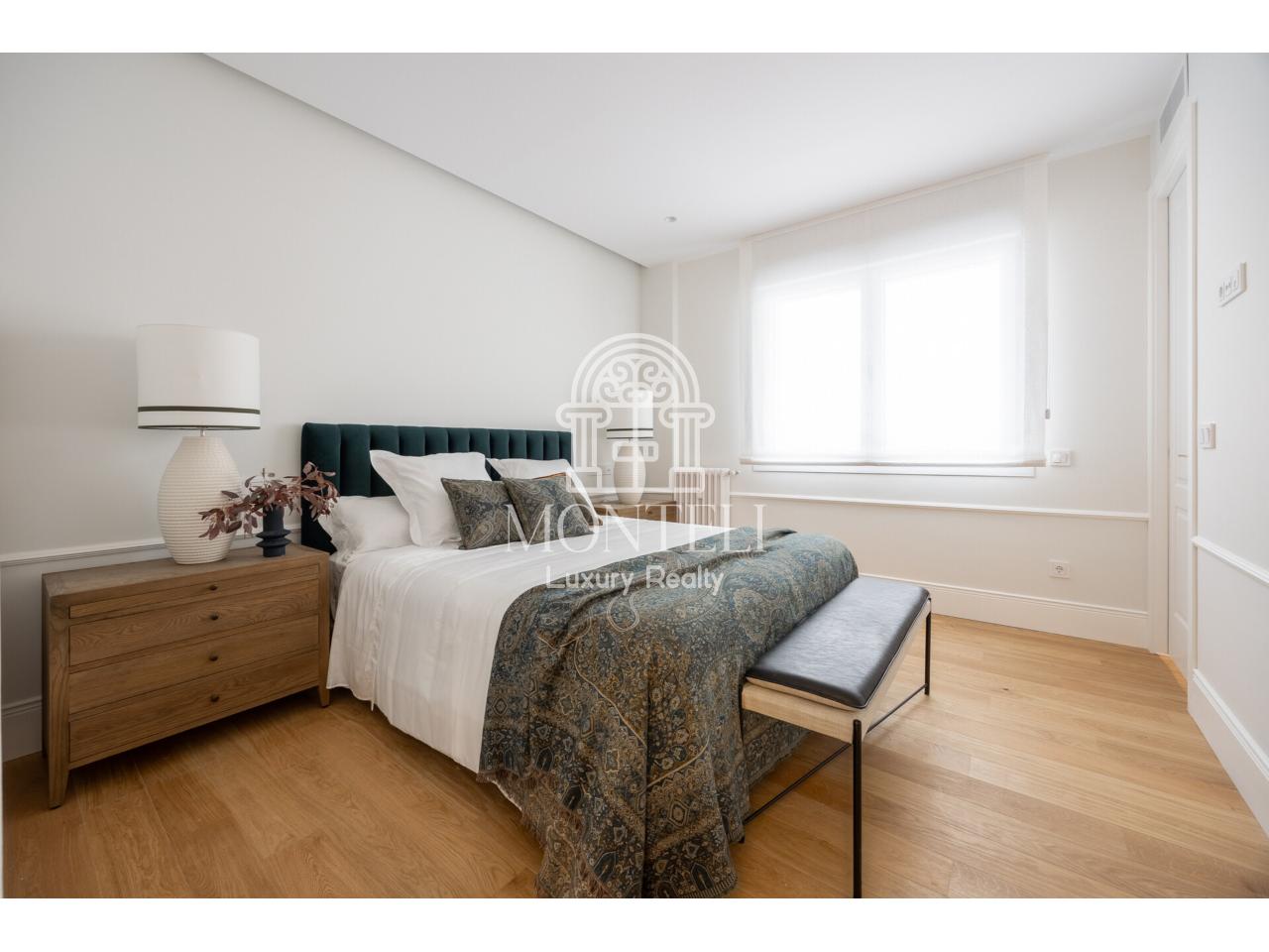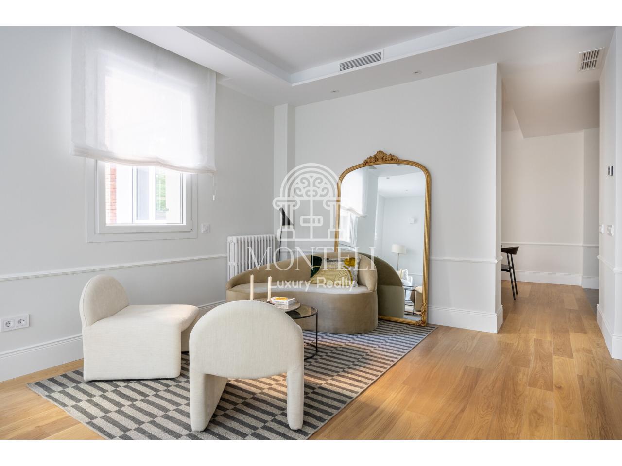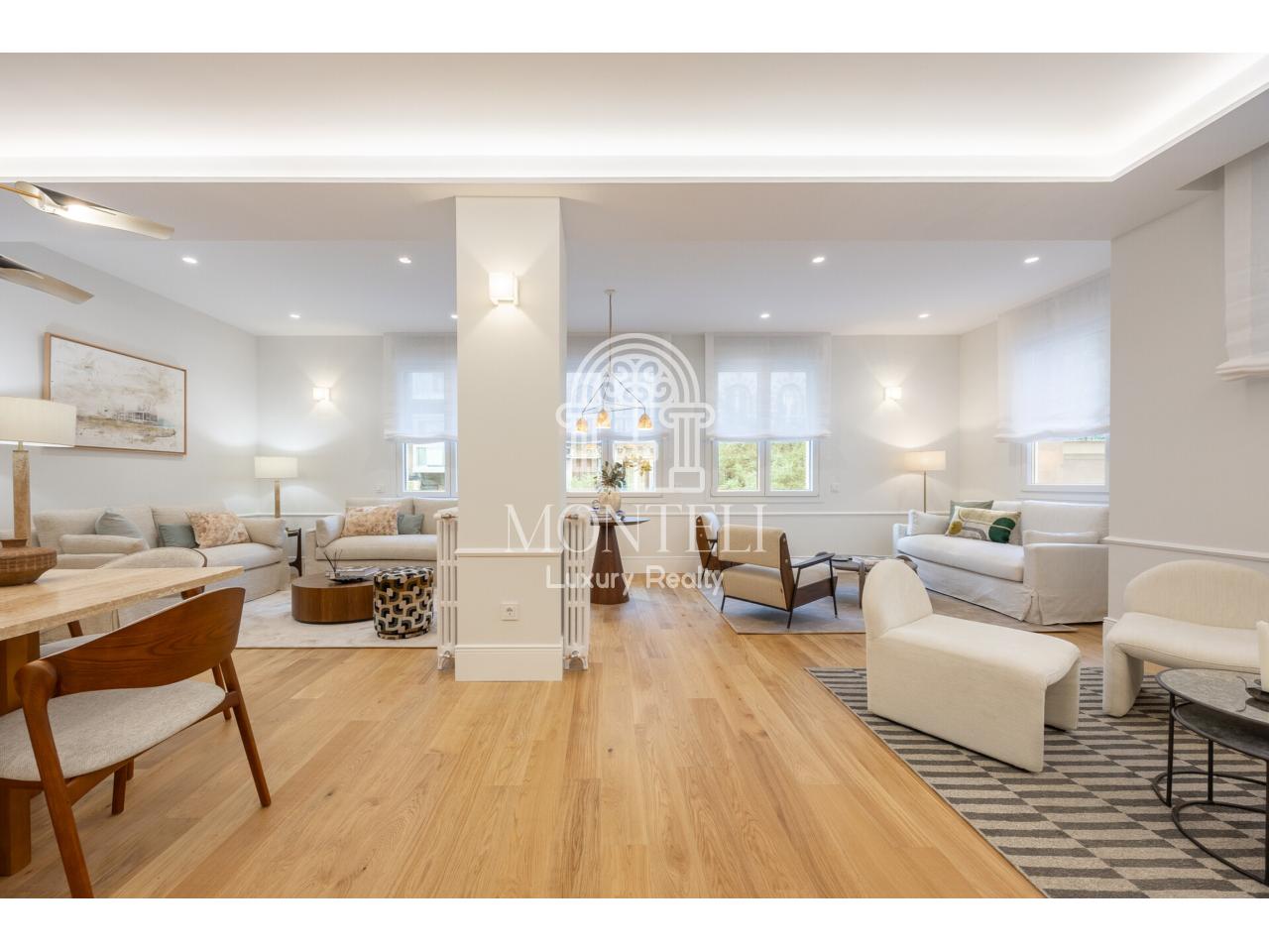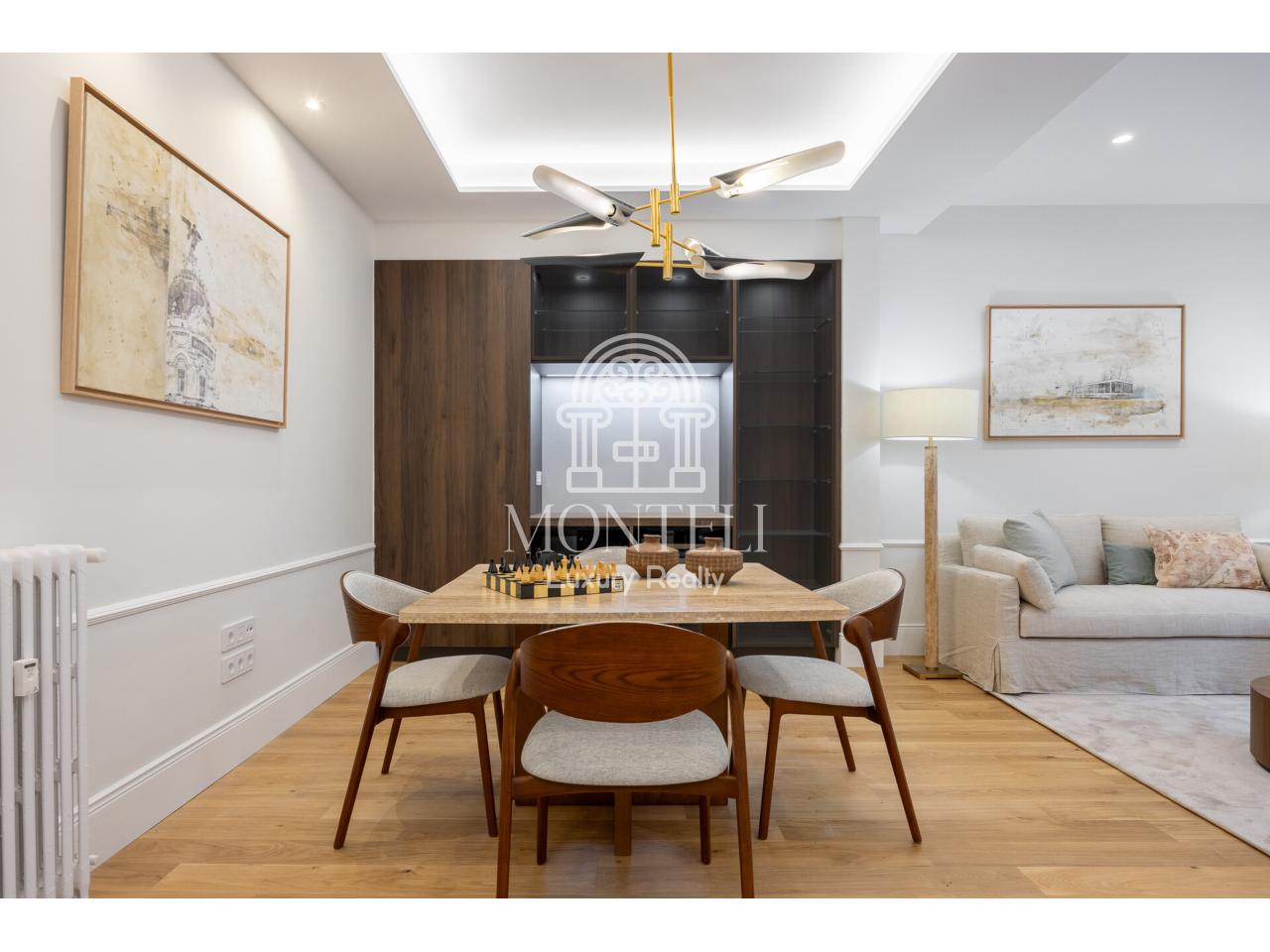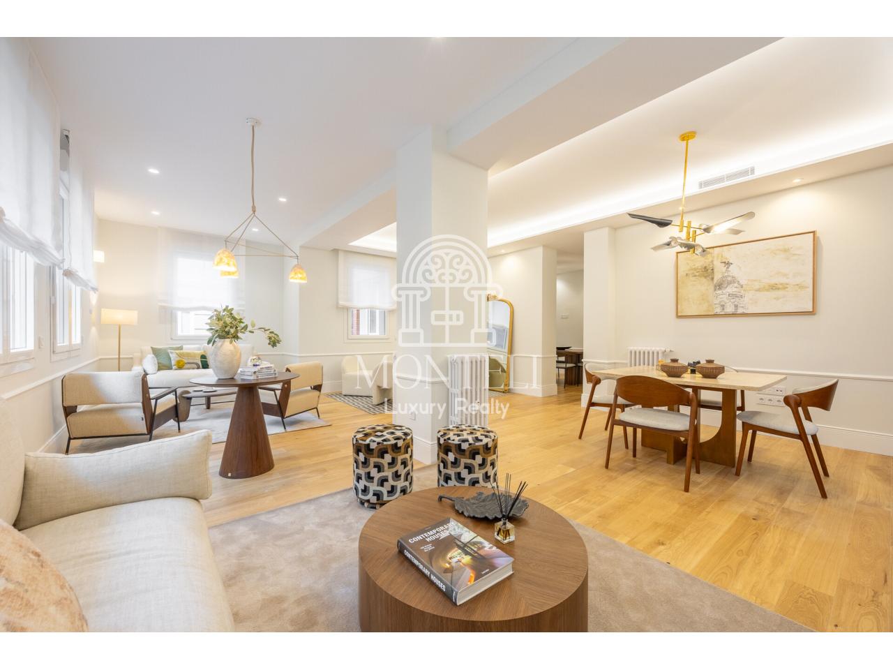 El piso, integralmente reformado de diseño, cuenta con 251 metros cuadrados y es muy luminoso por sus 9 ventanas a la arbolada calle Don Ramón de la Cruz con orientación sur. Está distribuido en cuatro ambientes diferentes de salones, una zona de bar, comedor, cocina abierta, terraza, 3 dormitorios en suite, aseo de cortesía y lavandería.