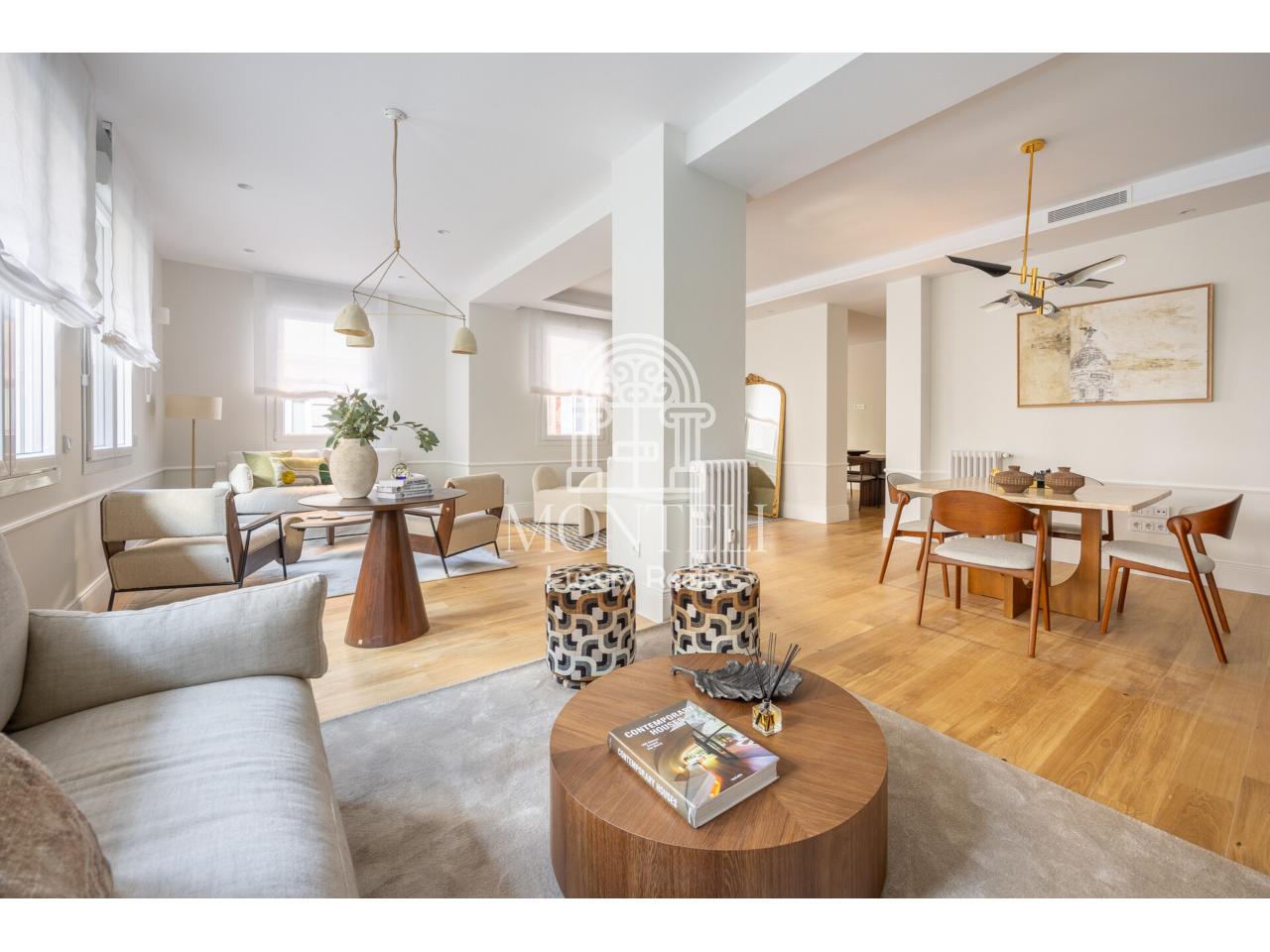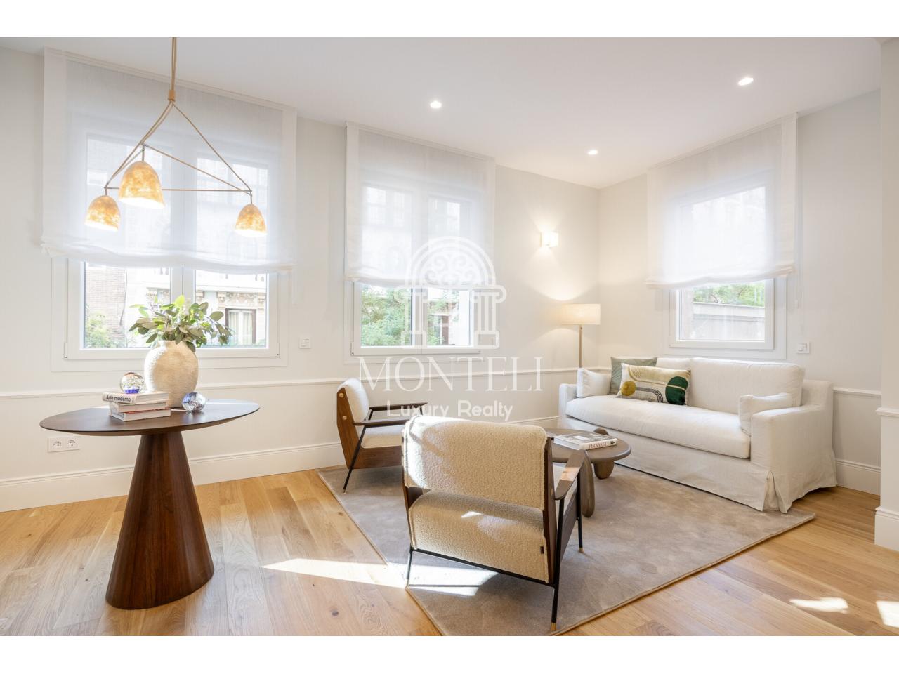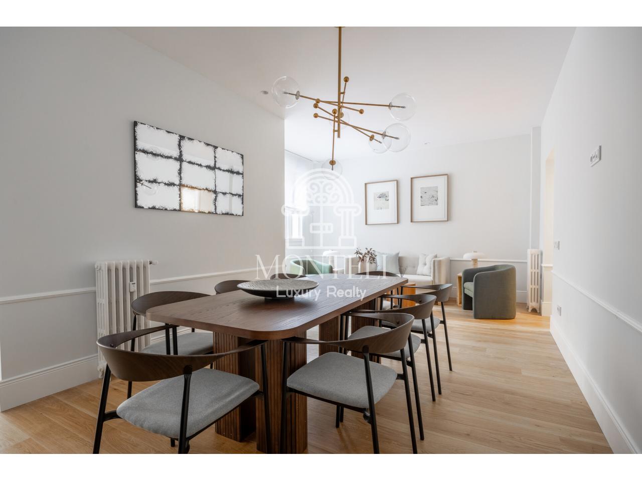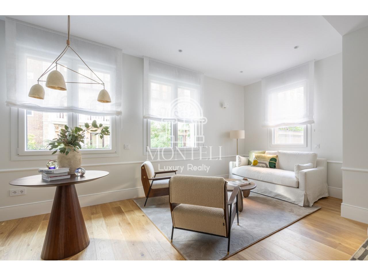 El piso, integralmente reformado de diseño, cuenta con 251 metros cuadrados y es muy luminoso por sus 9 ventanas a la arbolada calle Don Ramón de la Cruz con orientación sur. Está distribuido en cuatro ambientes diferentes de salones, una zona de bar, comedor, cocina abierta, terraza, 3 dormitorios en suite, aseo de cortesía y lavandería.