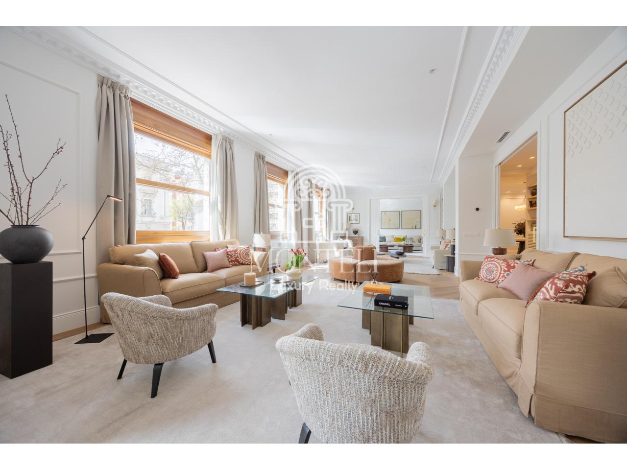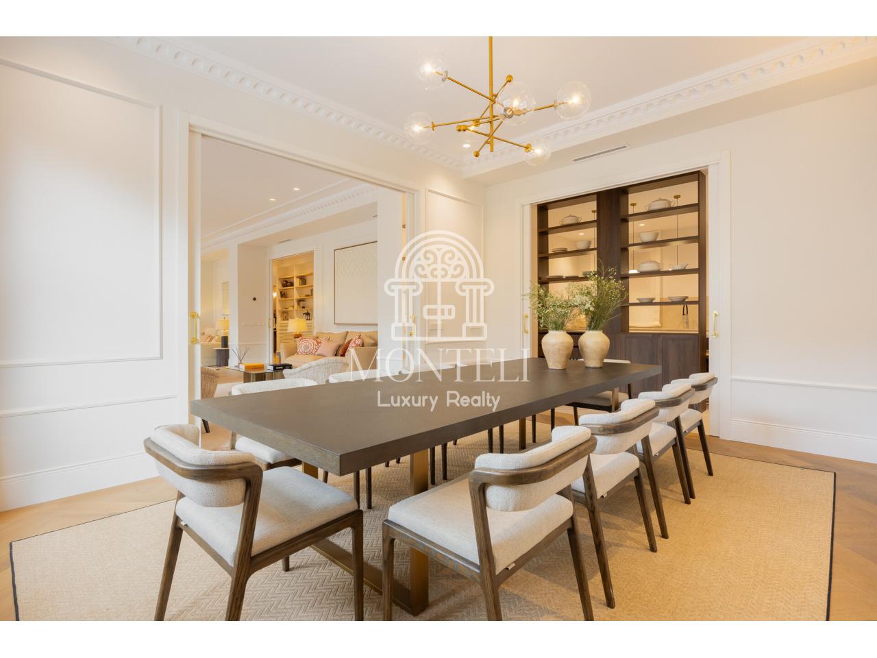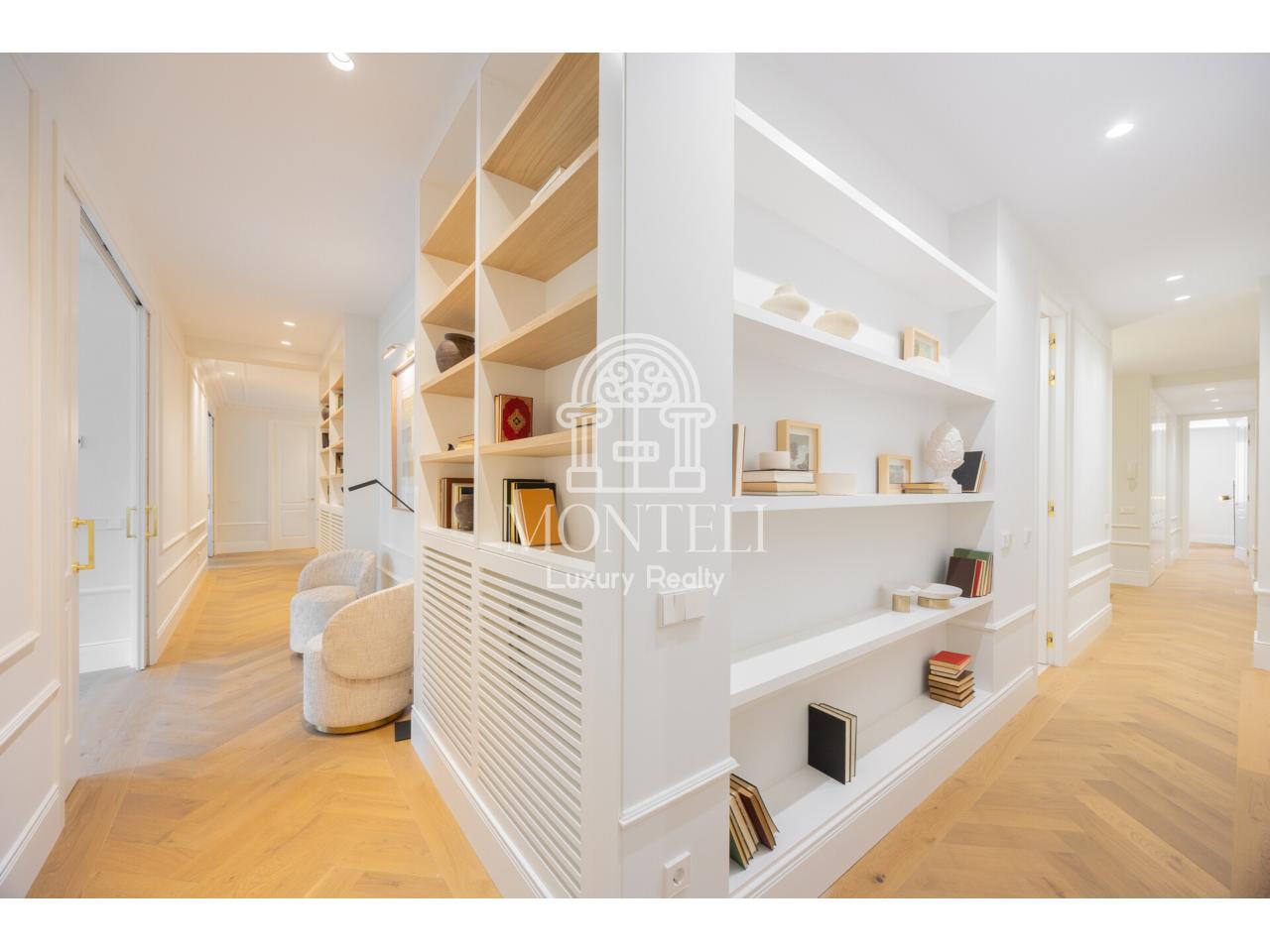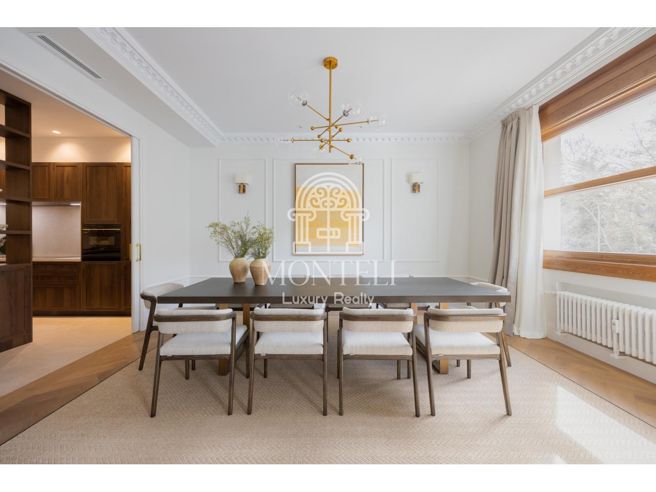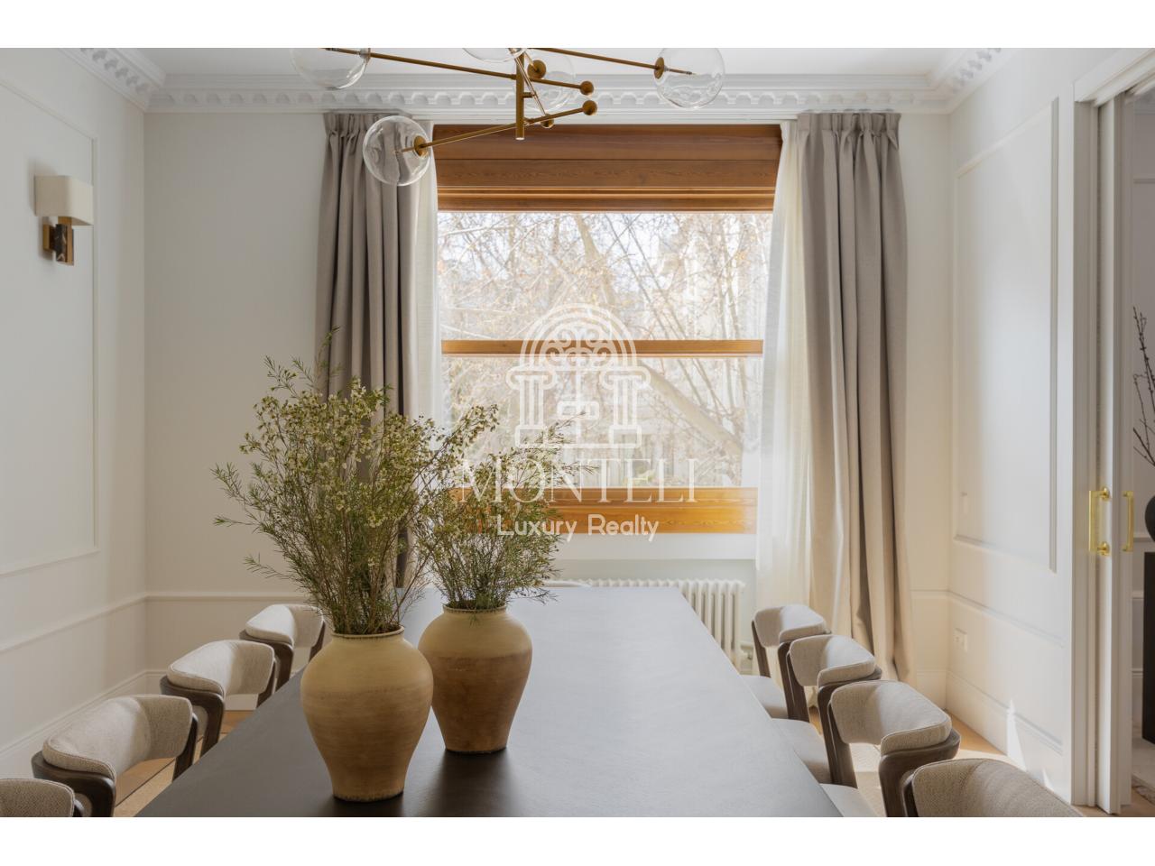 Ubicado en una primera planta con altura de segundo, el piso disfruta de unas espectaculares vistas abiertas a la Embajada de Italia, aportando una extraordinaria sensación de amplitud, luz y privacidad. Integralmente reformado de diseño, cuenta con 451 metros cuadrados distribuidos en tres elegantes zonas de salones, un amplio comedor, cocina semi-integrada y cuatro dormitorios en suite, destacando el principal con dos vestidores y dos baños.