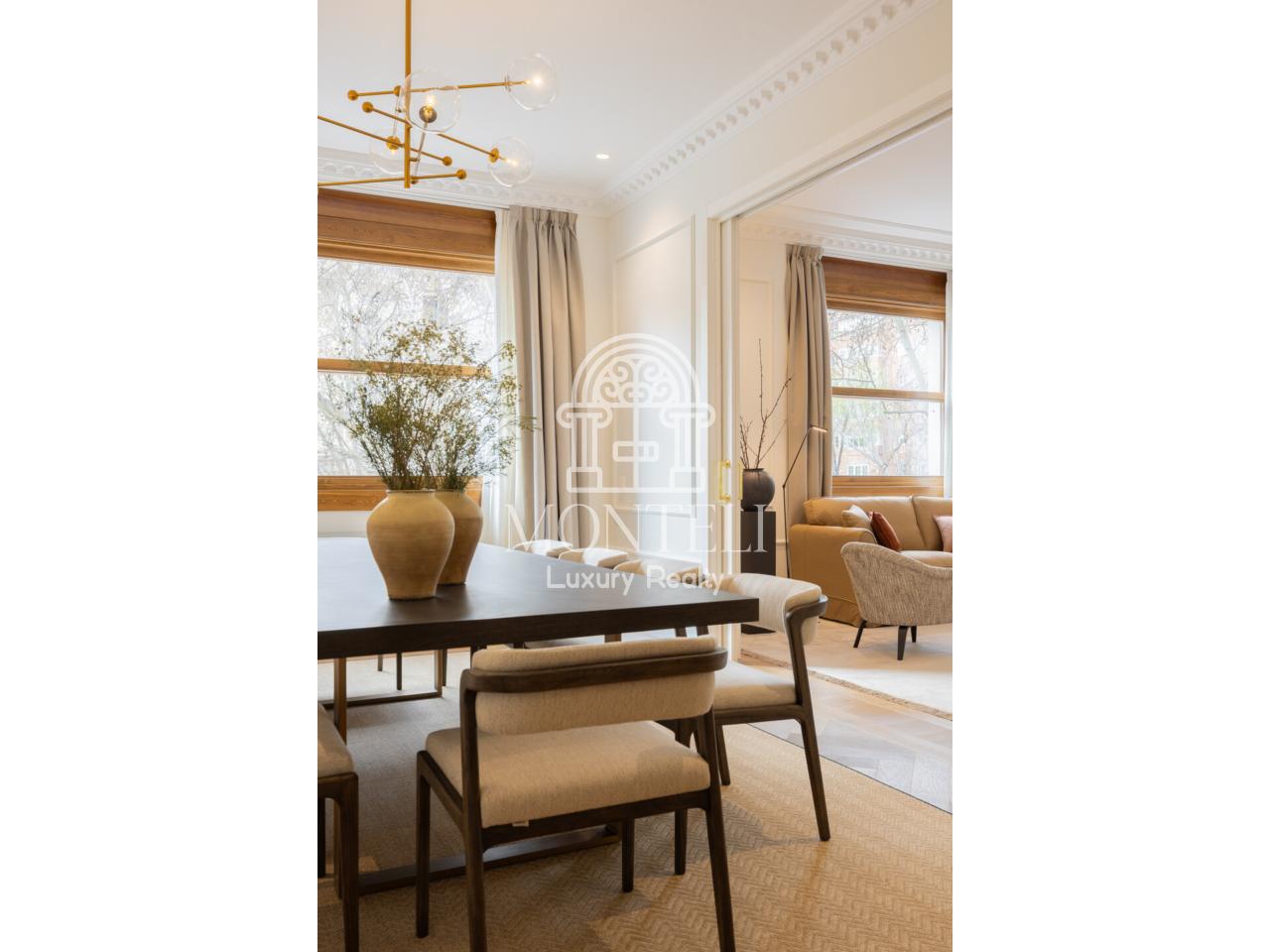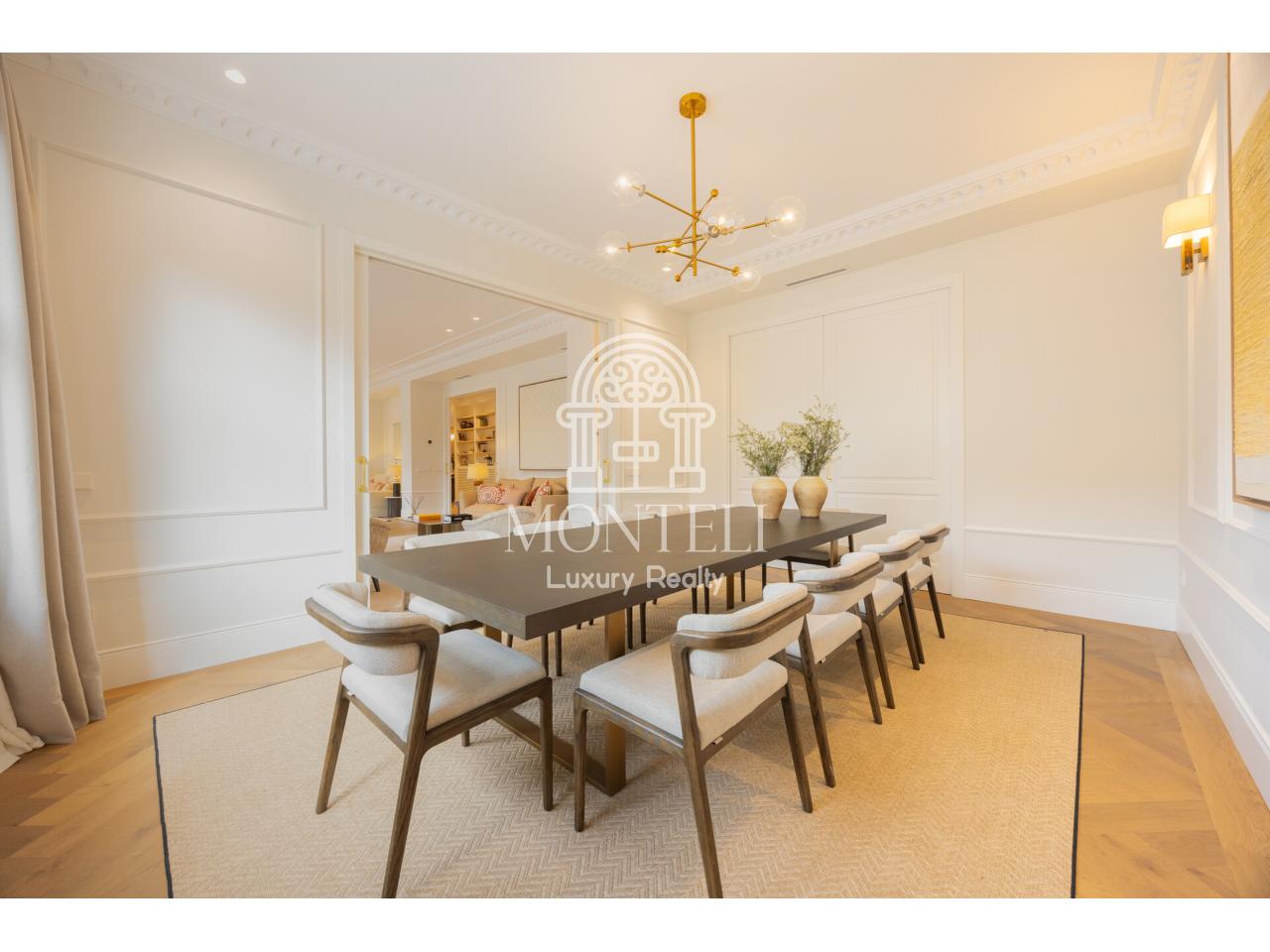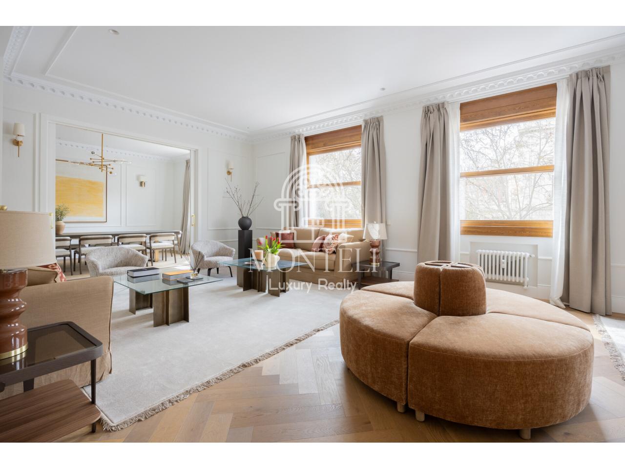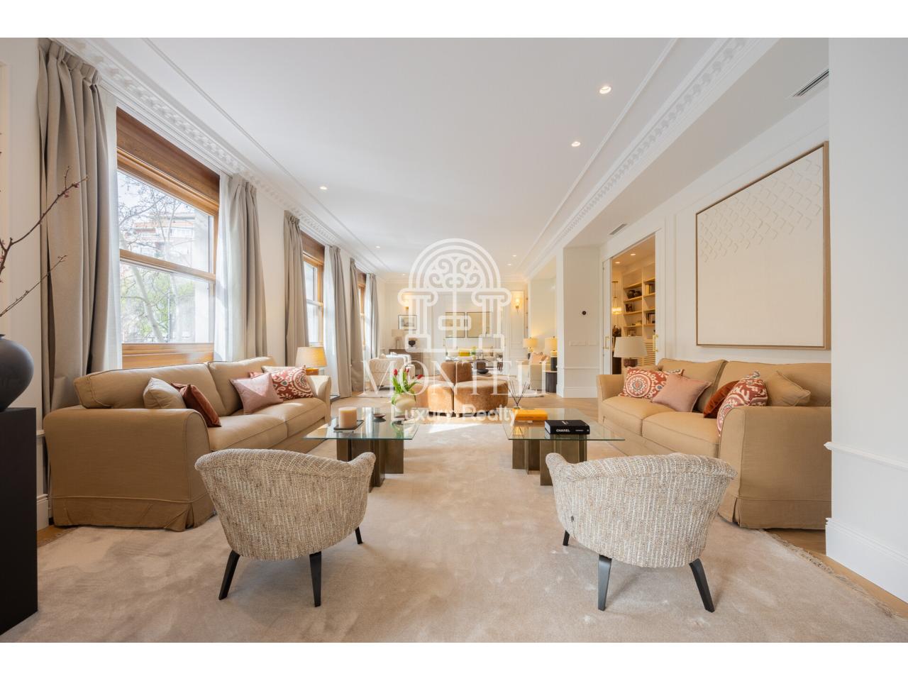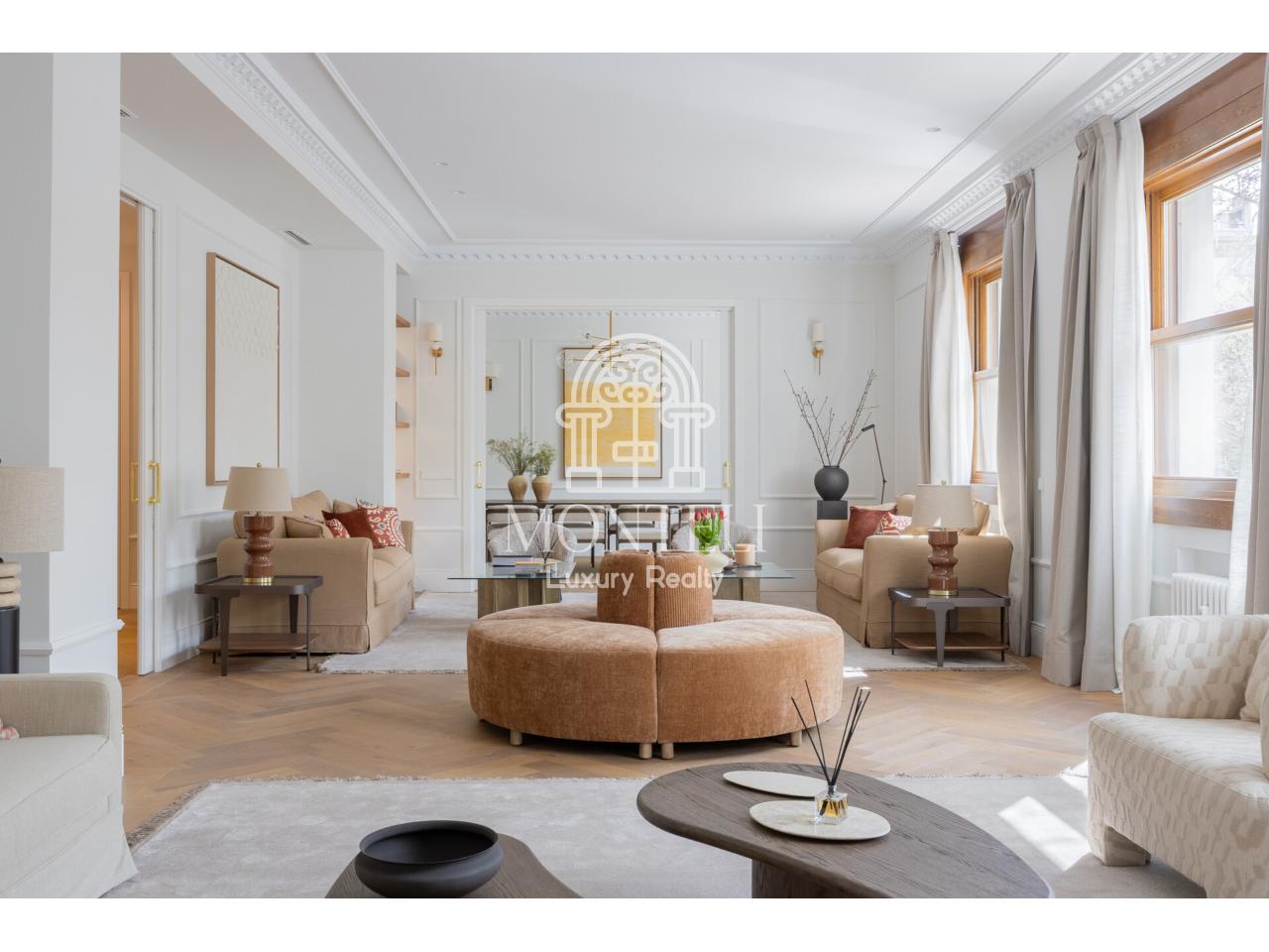 Ubicado en una primera planta con altura de segundo, el piso disfruta de unas espectaculares vistas abiertas a la Embajada de Italia, aportando una extraordinaria sensación de amplitud, luz y privacidad. Integralmente reformado de diseño, cuenta con 451 metros cuadrados distribuidos en tres elegantes zonas de salones, un amplio comedor, cocina semi-integrada y cuatro dormitorios en suite, destacando el principal con dos vestidores y dos baños.