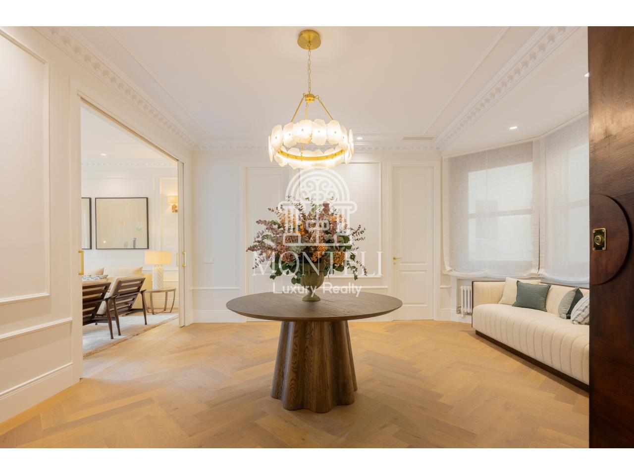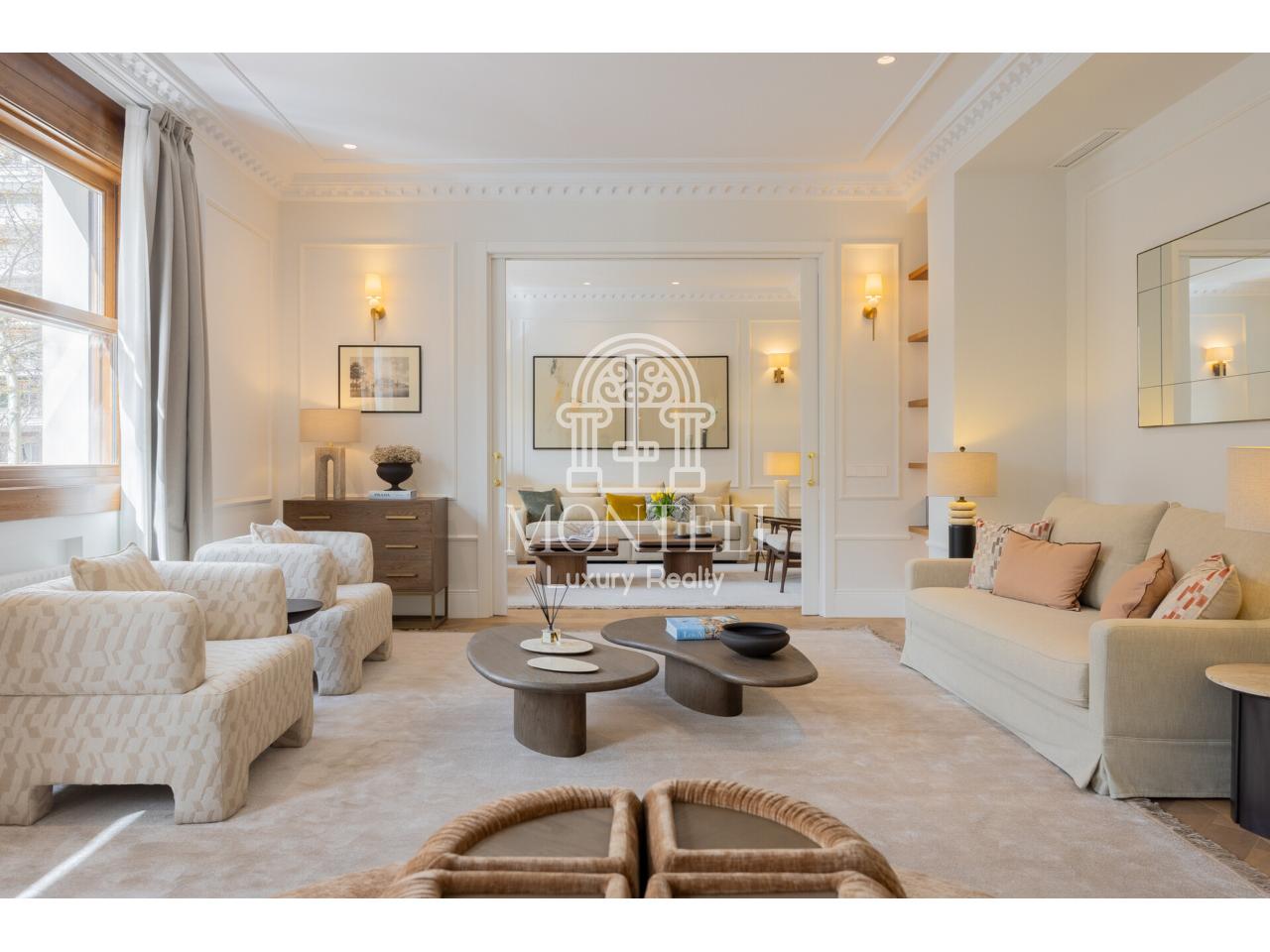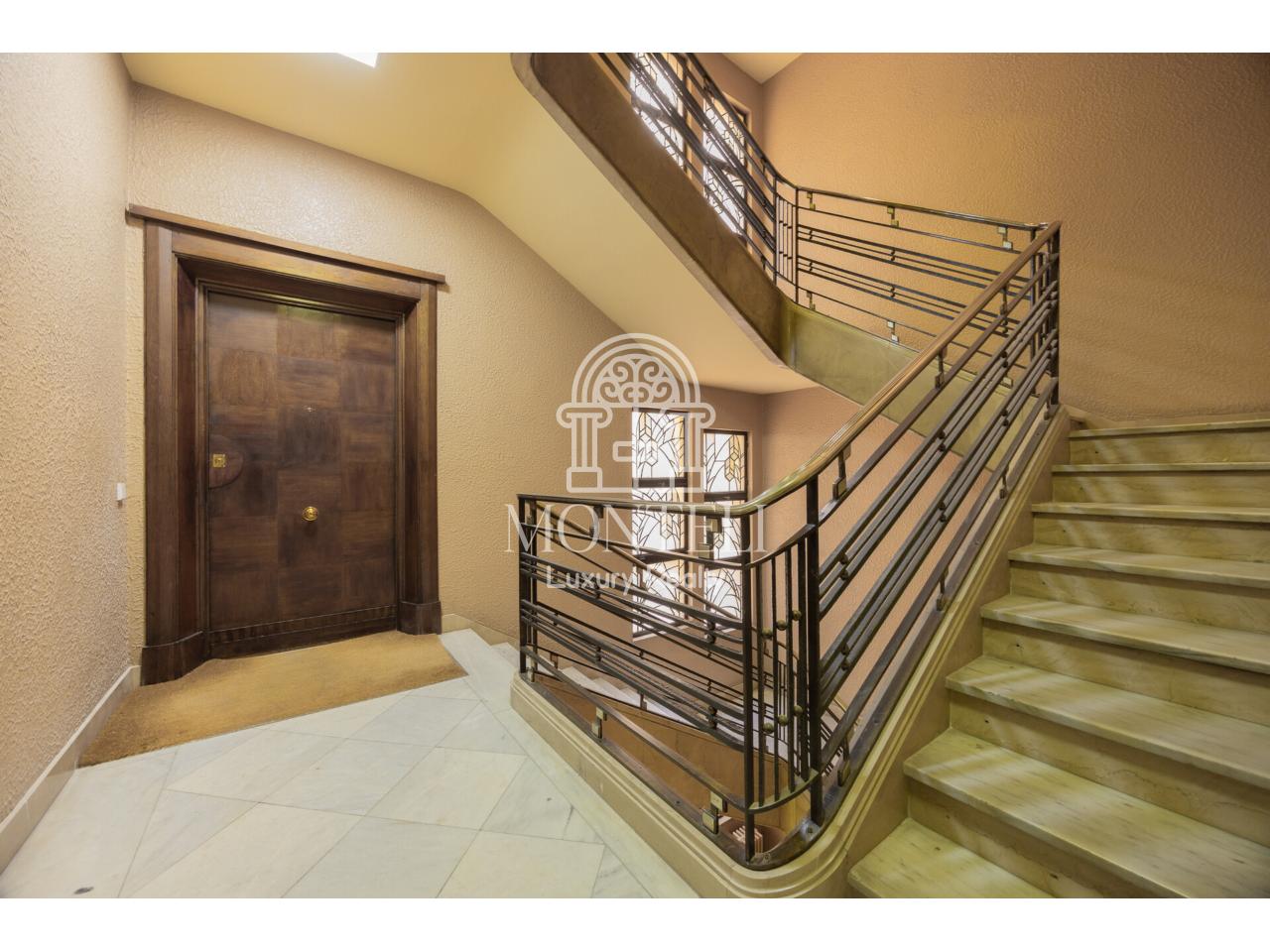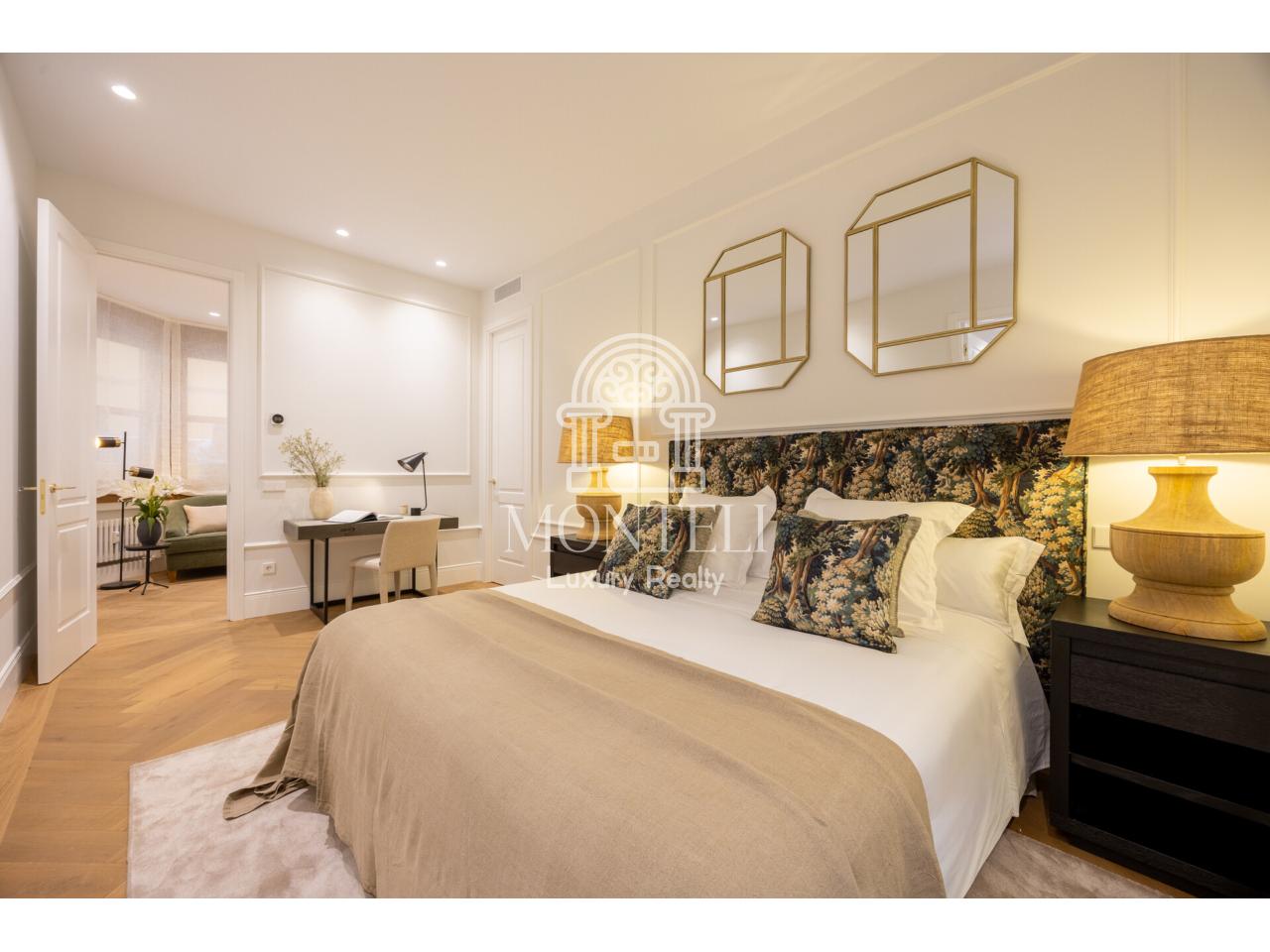 Ubicado en una primera planta con altura de segundo, el piso disfruta de unas espectaculares vistas abiertas a la Embajada de Italia, aportando una extraordinaria sensación de amplitud, luz y privacidad. Integralmente reformado de diseño, cuenta con 451 metros cuadrados distribuidos en tres elegantes zonas de salones, un amplio comedor, cocina semi-integrada y cuatro dormitorios en suite, destacando el principal con dos vestidores y dos baños.