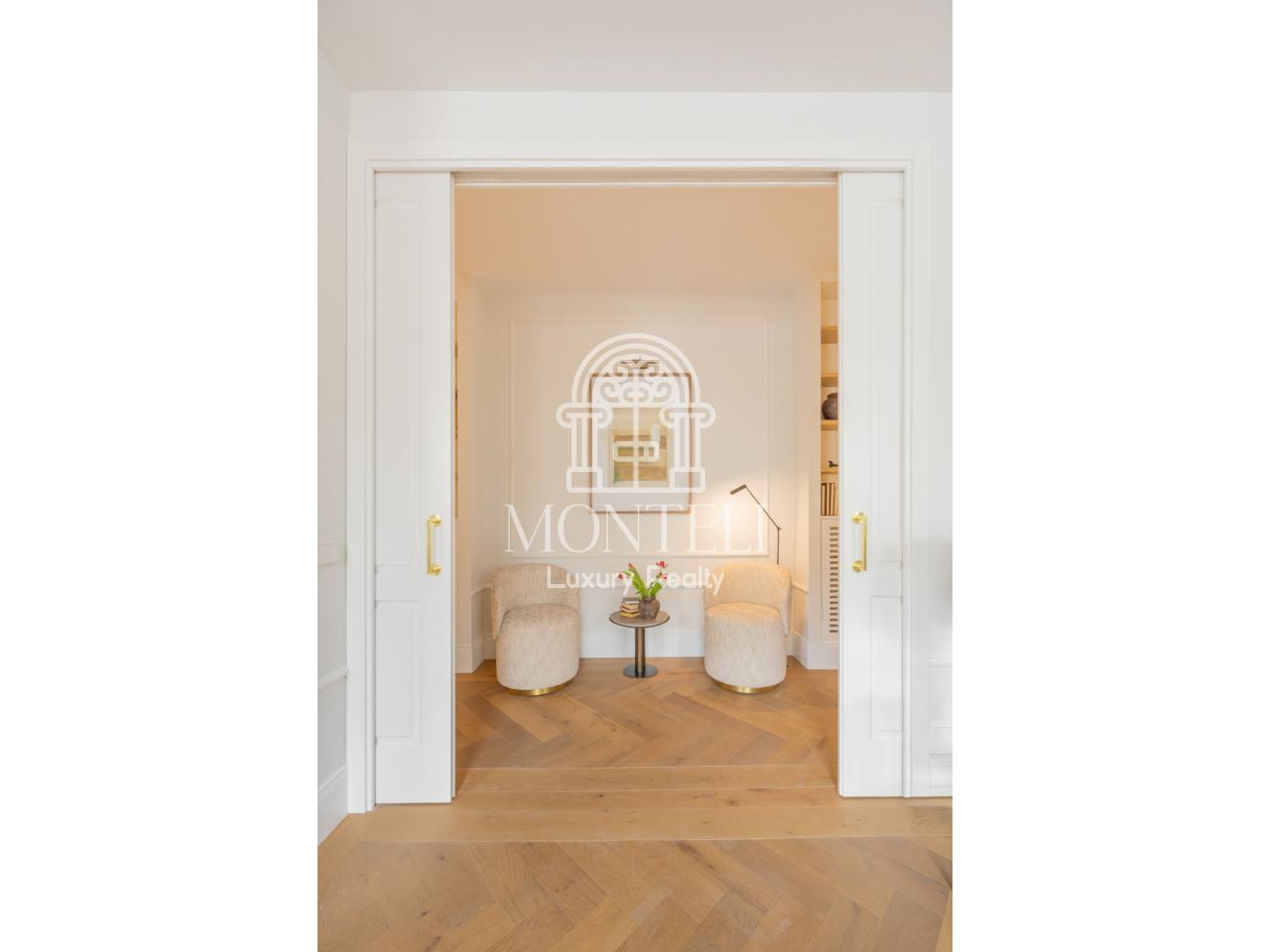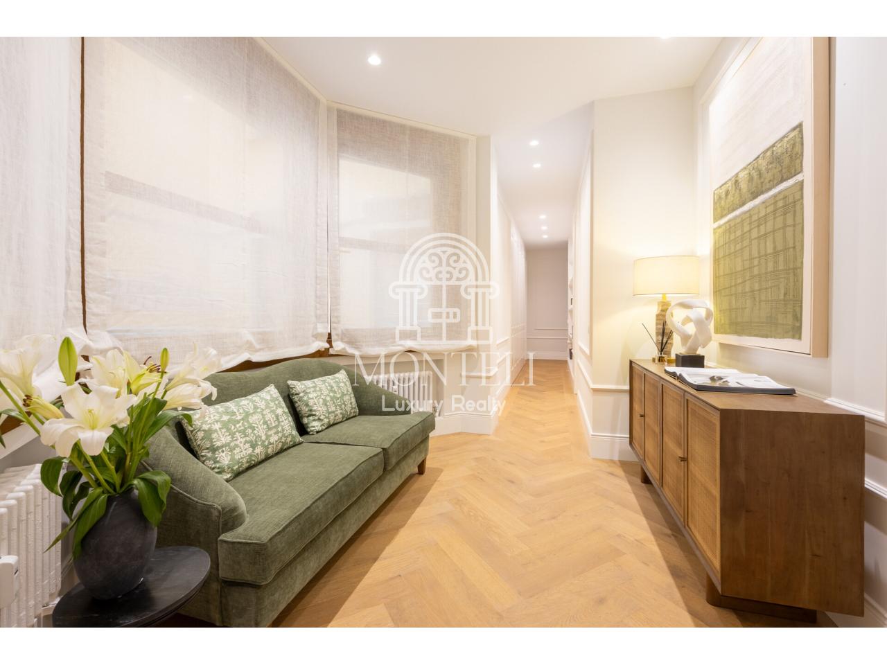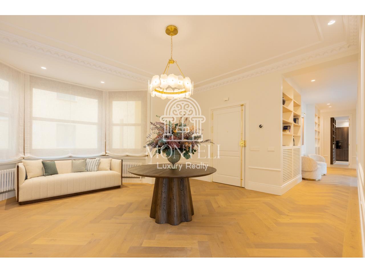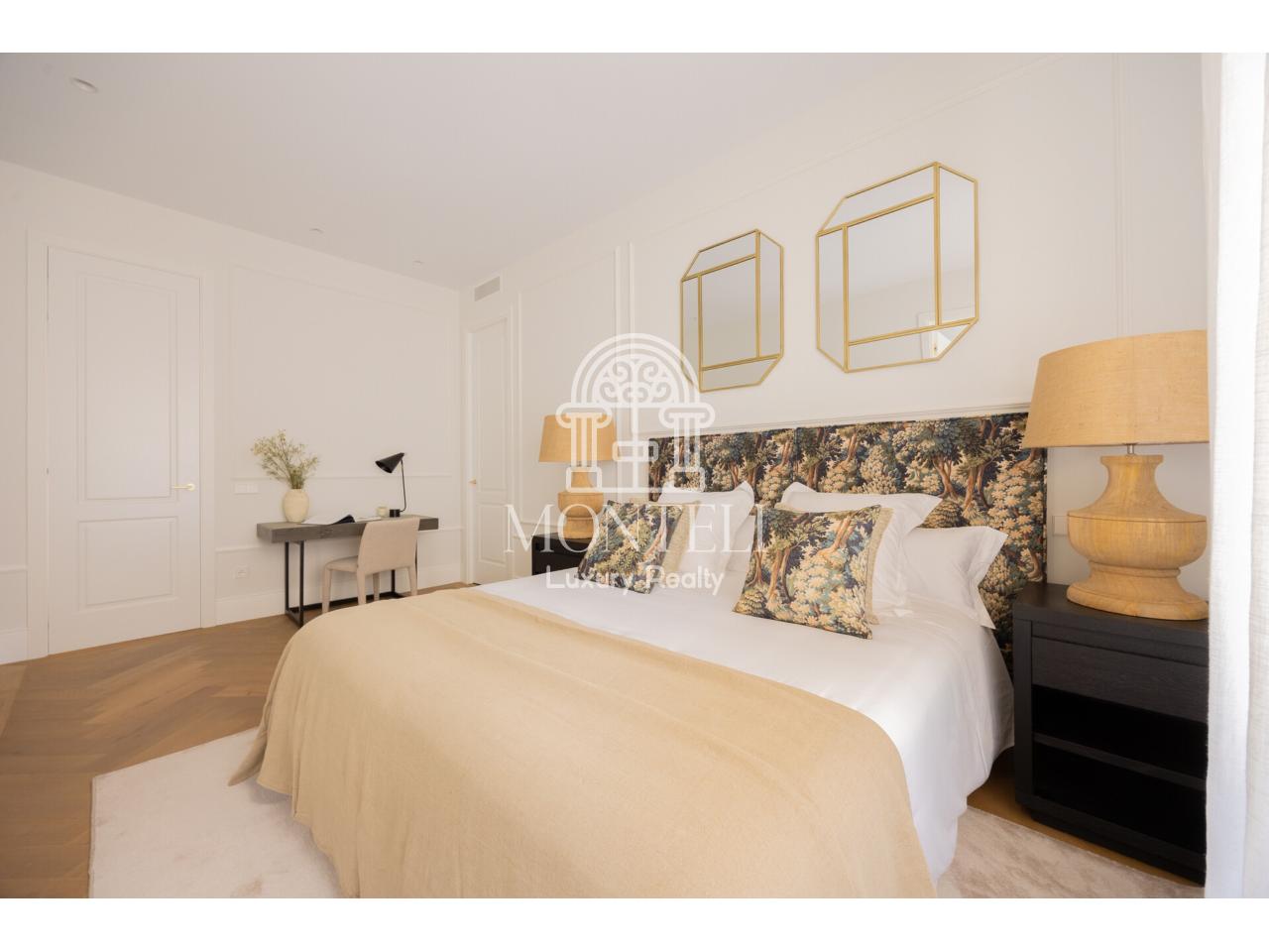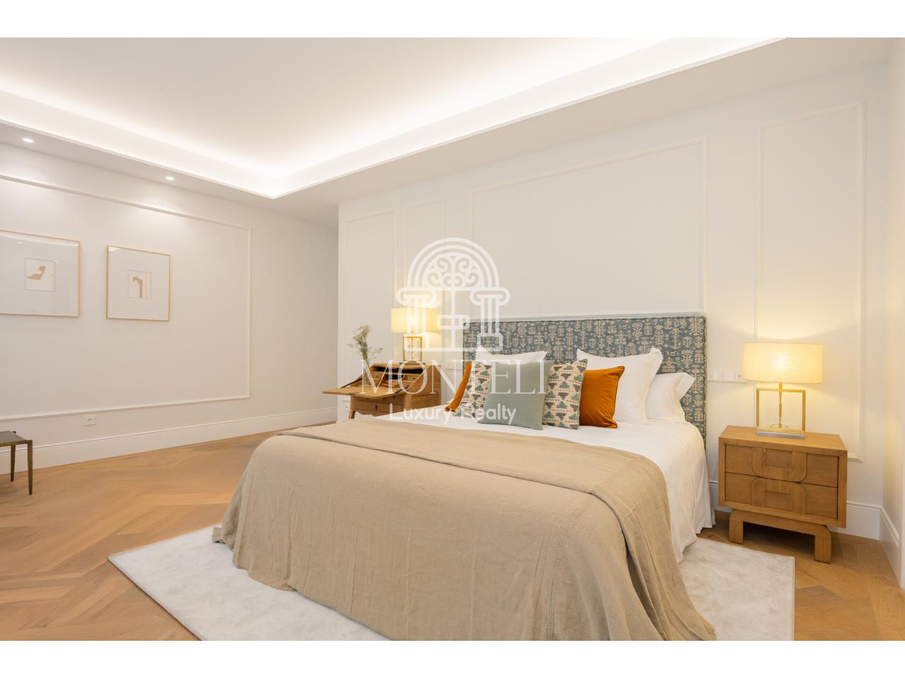 Ubicado en una primera planta con altura de segundo, el piso disfruta de unas espectaculares vistas abiertas a la Embajada de Italia, aportando una extraordinaria sensación de amplitud, luz y privacidad. Integralmente reformado de diseño, cuenta con 451 metros cuadrados distribuidos en tres elegantes zonas de salones, un amplio comedor, cocina semi-integrada y cuatro dormitorios en suite, destacando el principal con dos vestidores y dos baños.