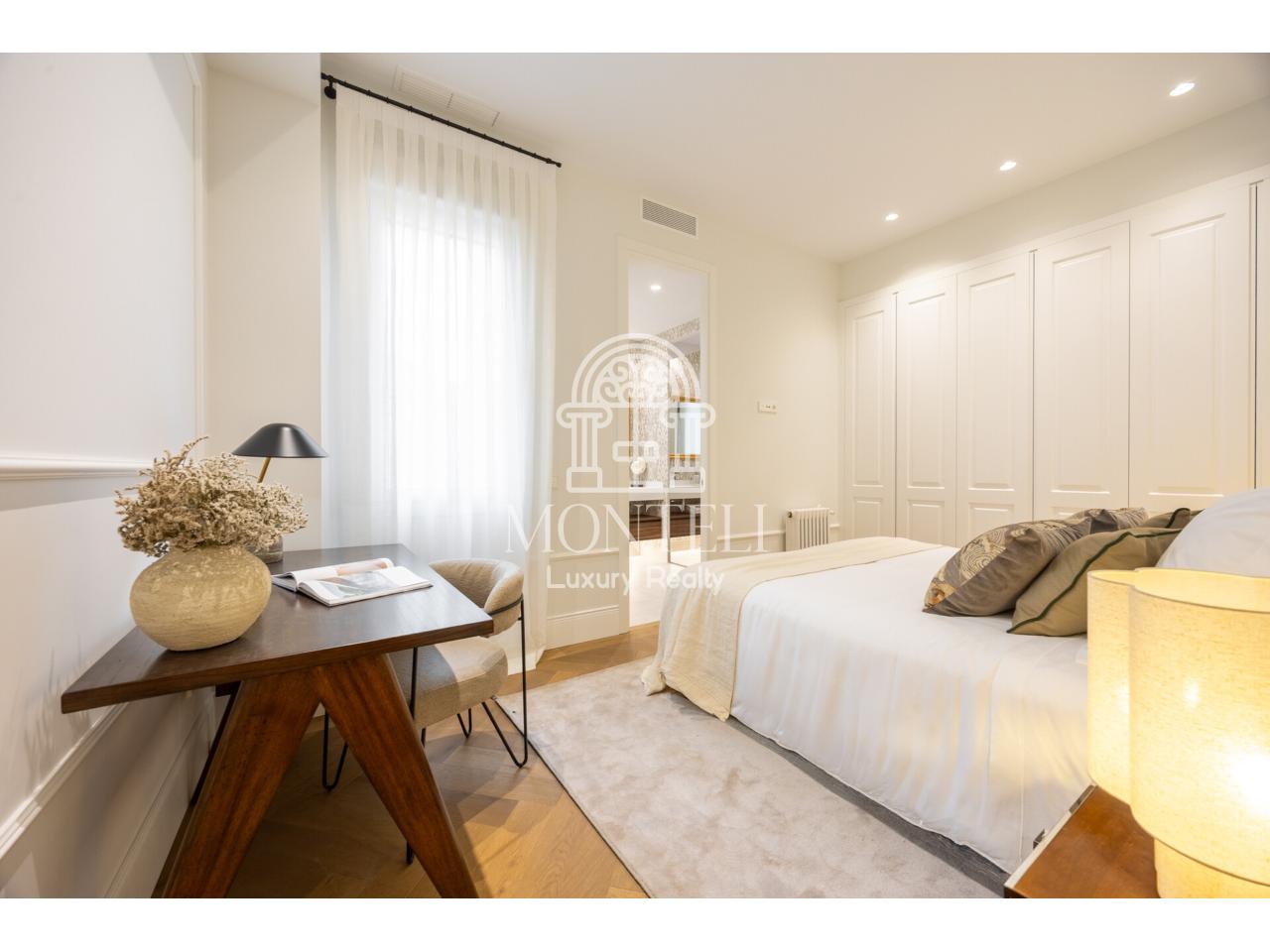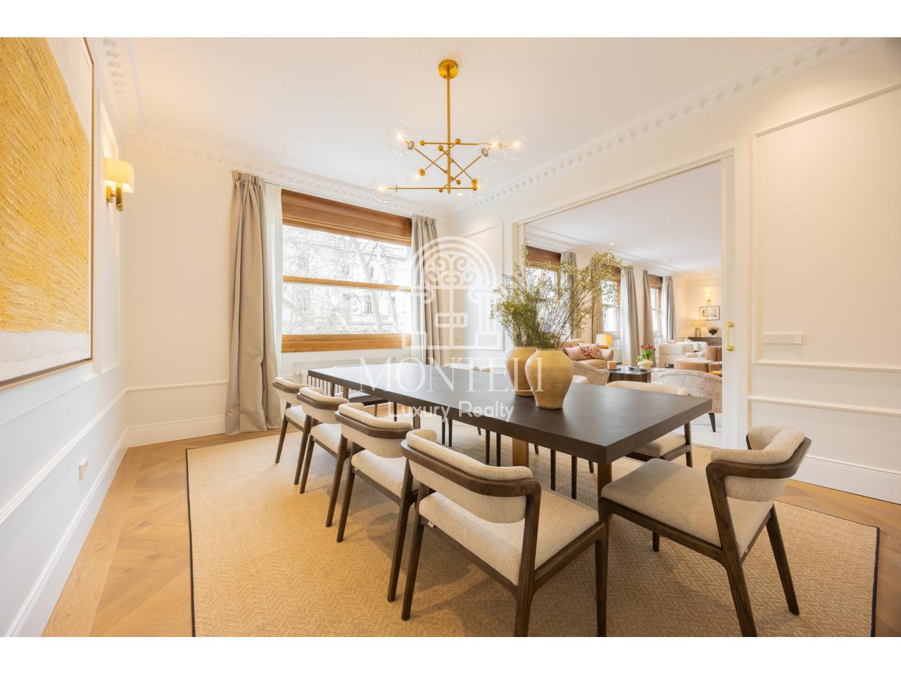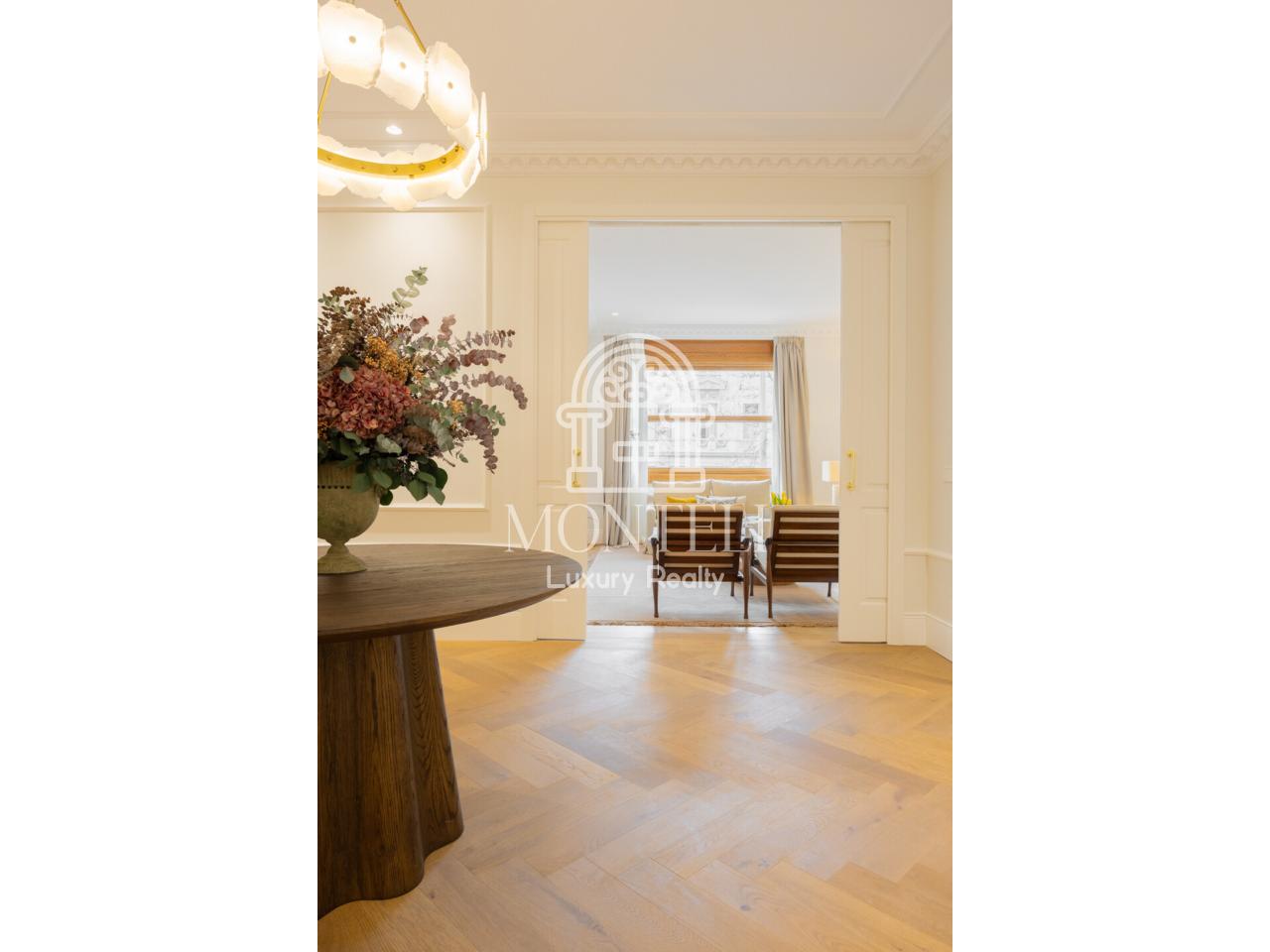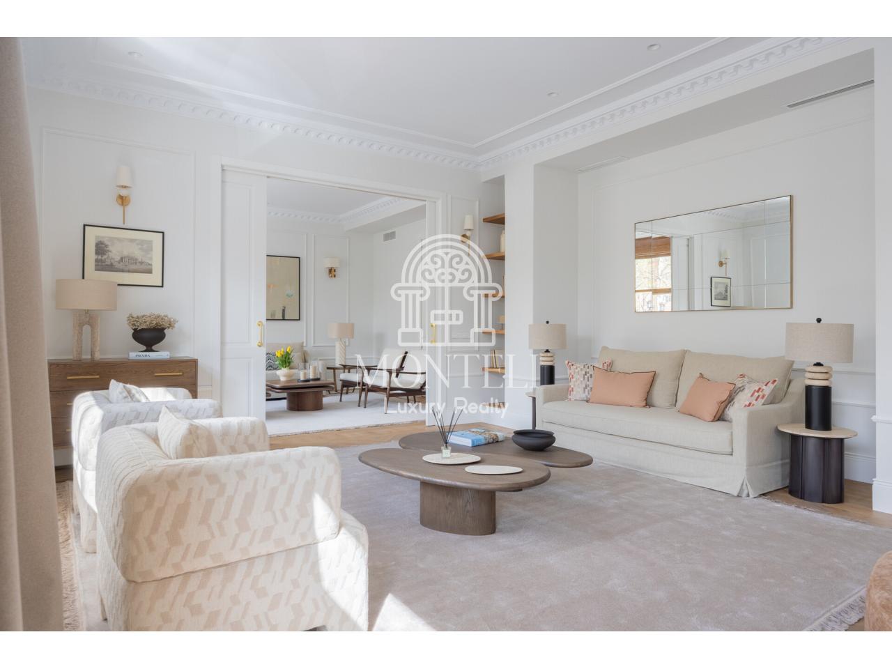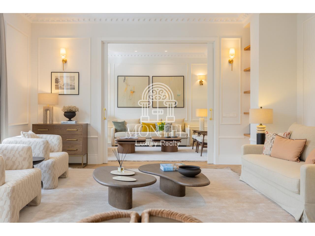Ubicado en una primera planta con altura de segundo, el piso disfruta de unas espectaculares vistas abiertas a la Embajada de Italia, aportando una extraordinaria sensación de amplitud, luz y privacidad. Integralmente reformado de diseño, cuenta con 451 metros cuadrados distribuidos en tres elegantes zonas de salones, un amplio comedor, cocina semi-integrada y cuatro dormitorios en suite, destacando el principal con dos vestidores y dos baños.