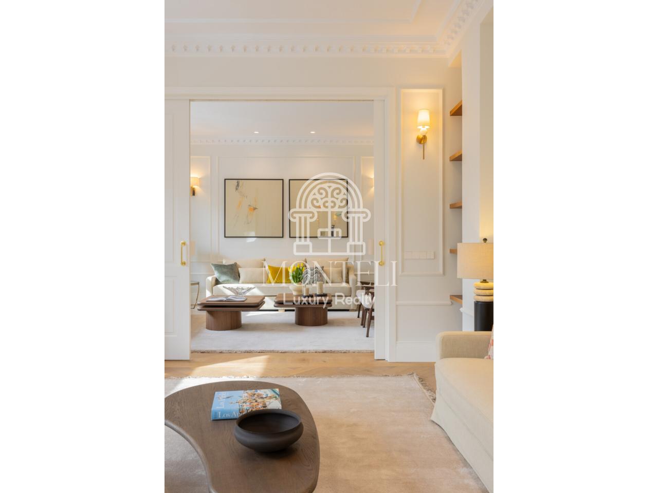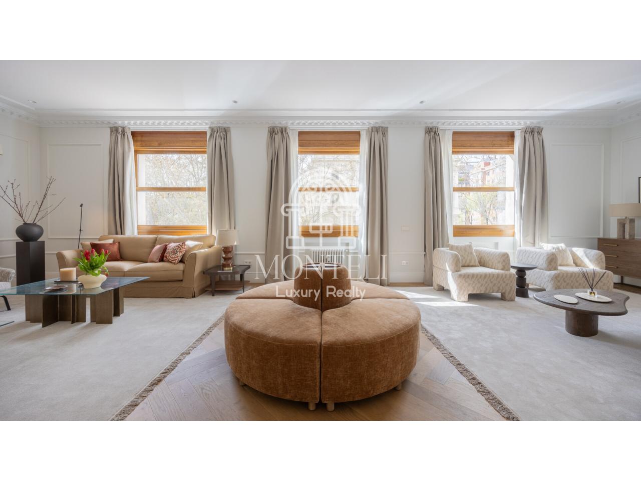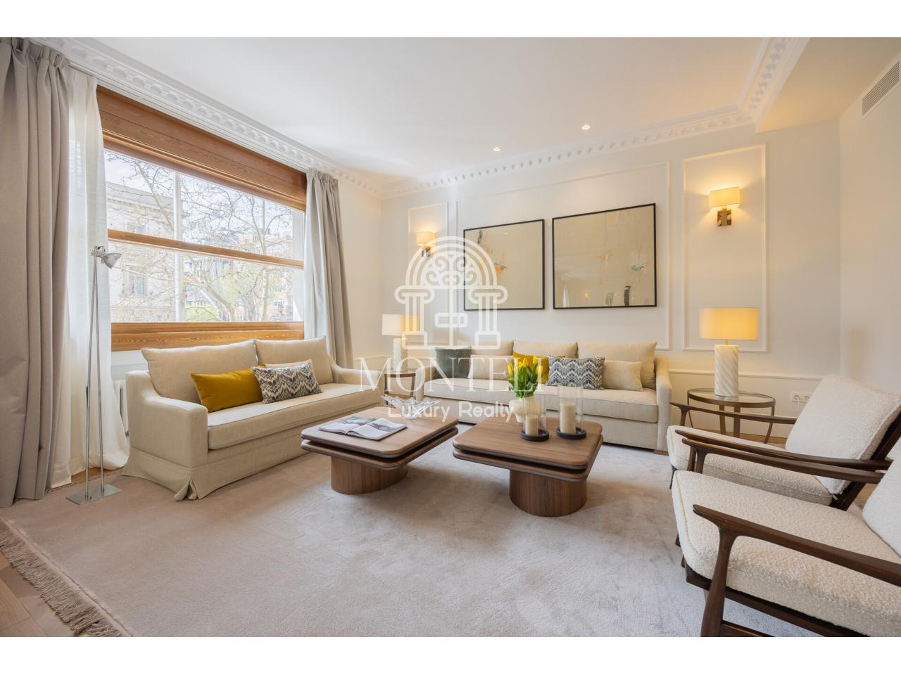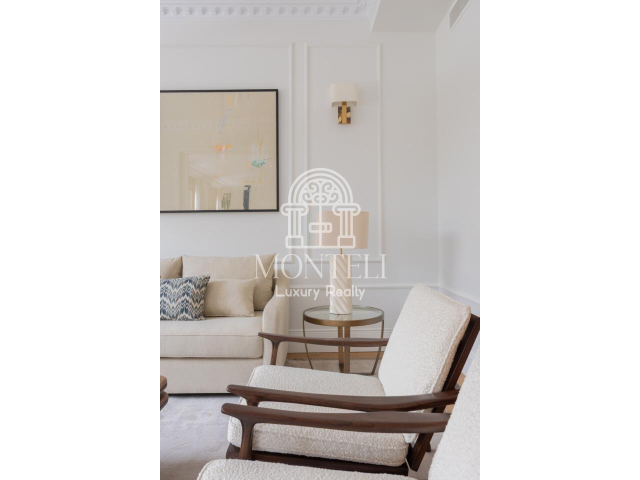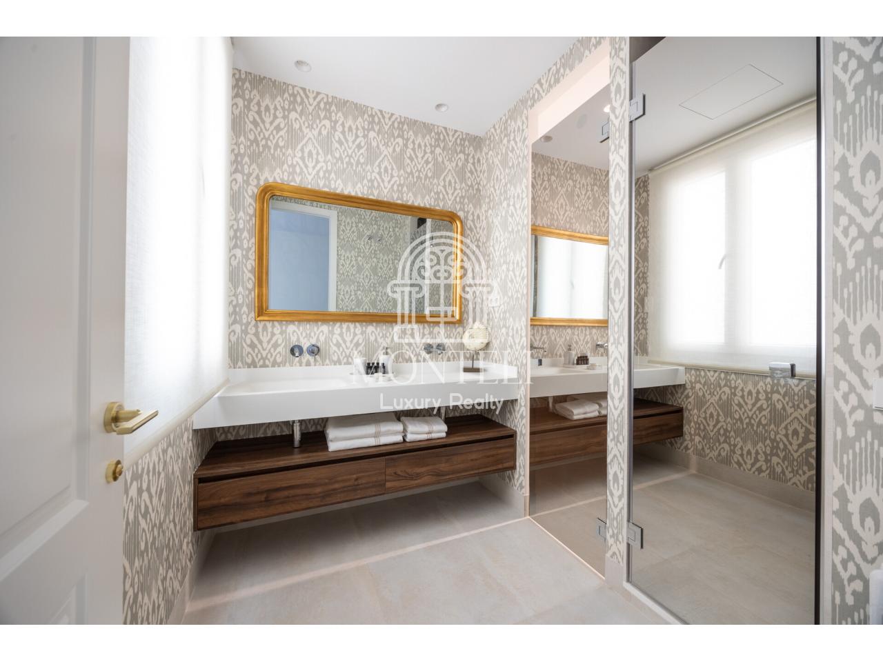 Ubicado en una primera planta con altura de segundo, el piso disfruta de unas espectaculares vistas abiertas a la Embajada de Italia, aportando una extraordinaria sensación de amplitud, luz y privacidad. Integralmente reformado de diseño, cuenta con 451 metros cuadrados distribuidos en tres elegantes zonas de salones, un amplio comedor, cocina semi-integrada y cuatro dormitorios en suite, destacando el principal con dos vestidores y dos baños.