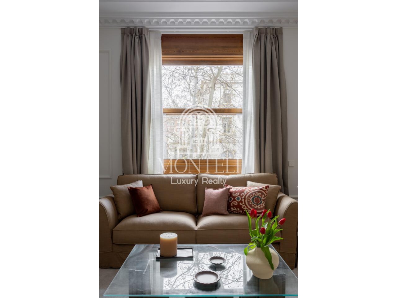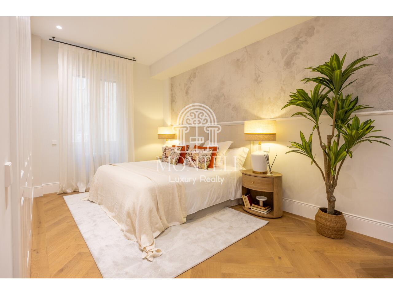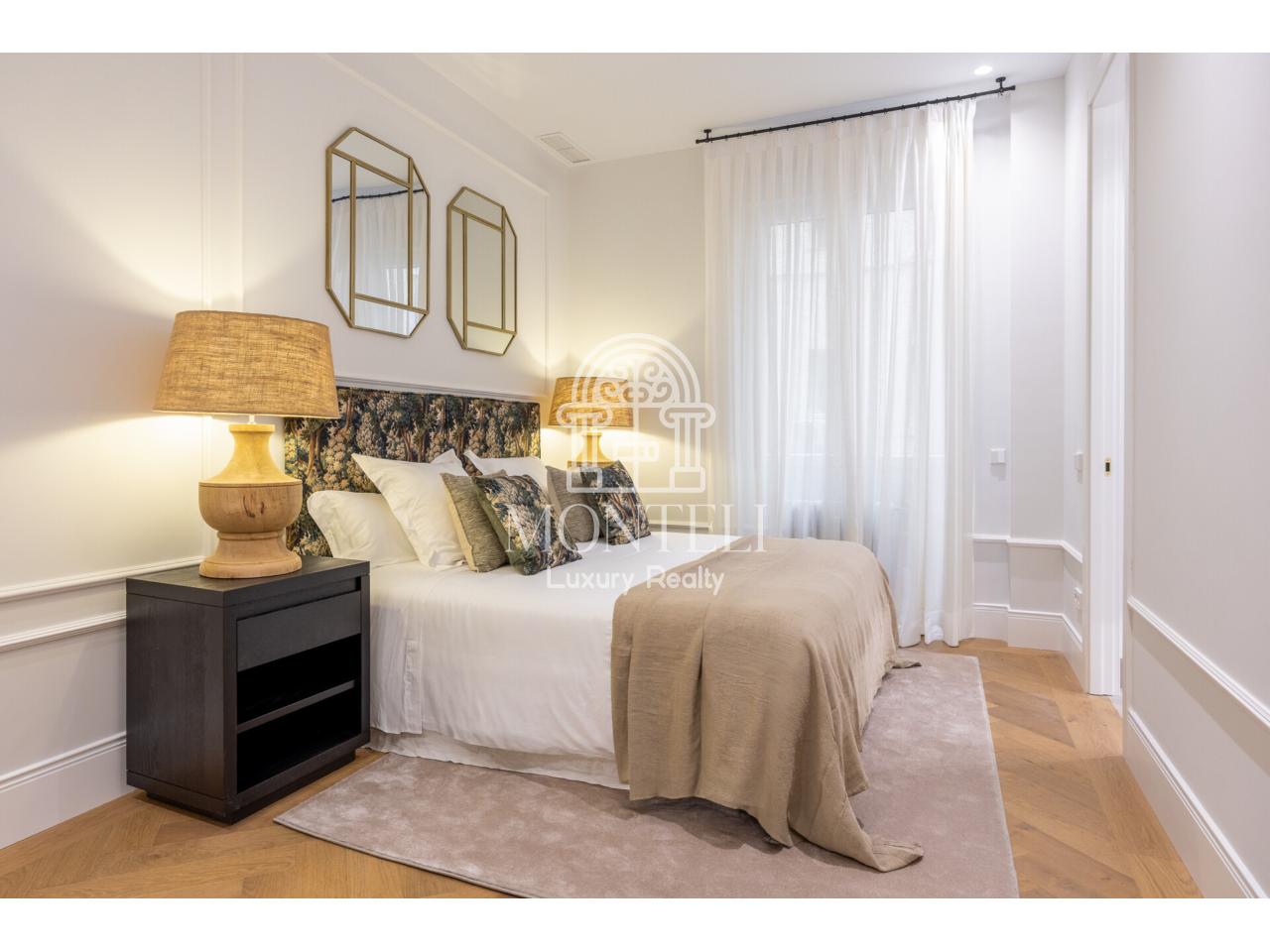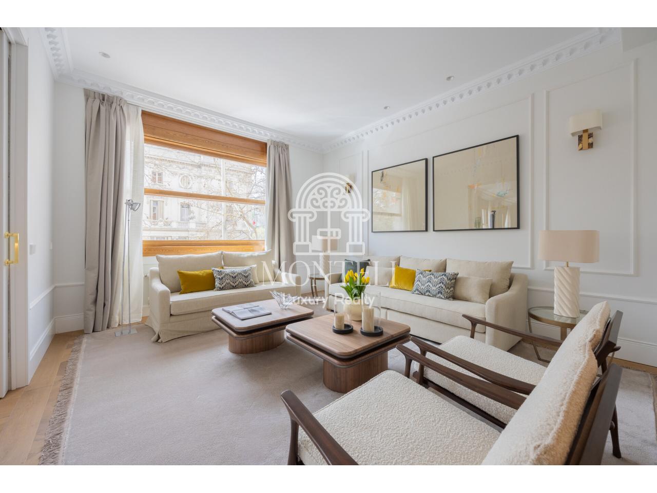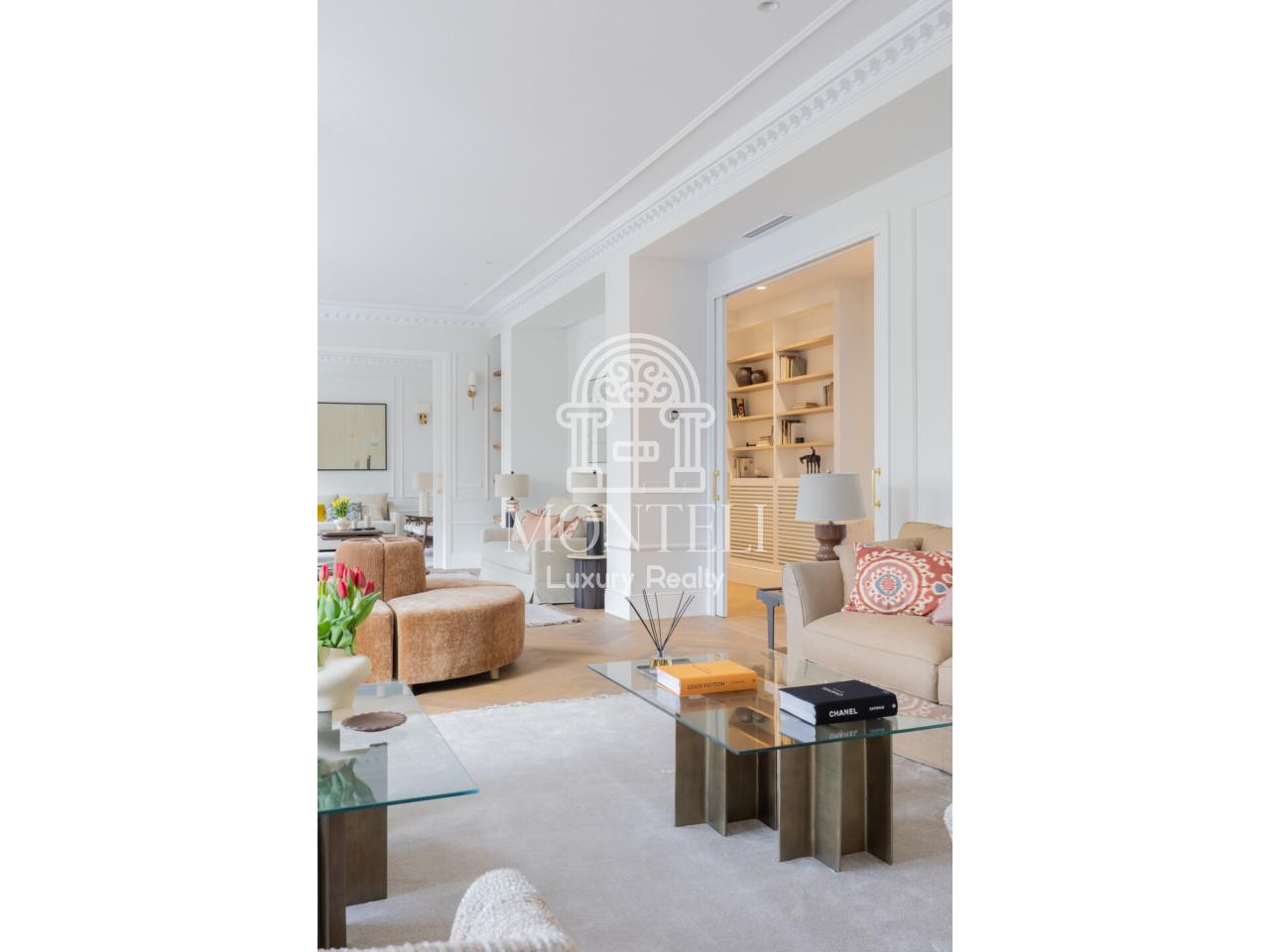 Ubicado en una primera planta con altura de segundo, el piso disfruta de unas espectaculares vistas abiertas a la Embajada de Italia, aportando una extraordinaria sensación de amplitud, luz y privacidad. Integralmente reformado de diseño, cuenta con 451 metros cuadrados distribuidos en tres elegantes zonas de salones, un amplio comedor, cocina semi-integrada y cuatro dormitorios en suite, destacando el principal con dos vestidores y dos baños.