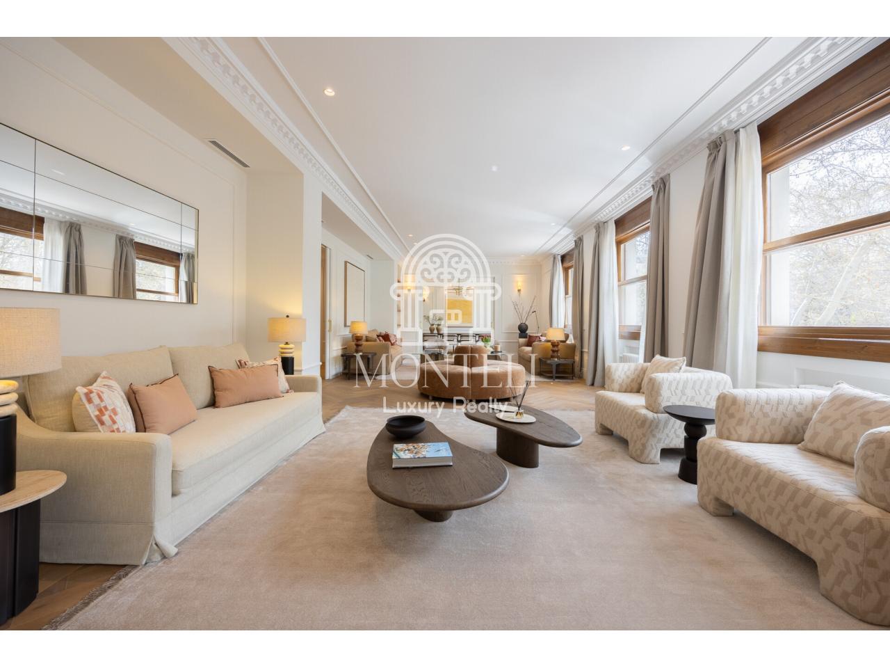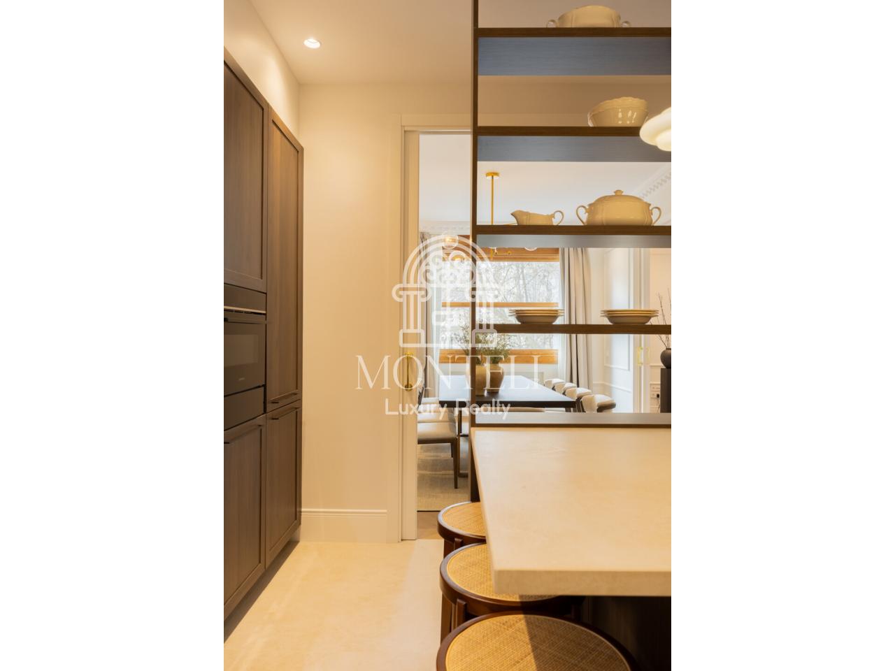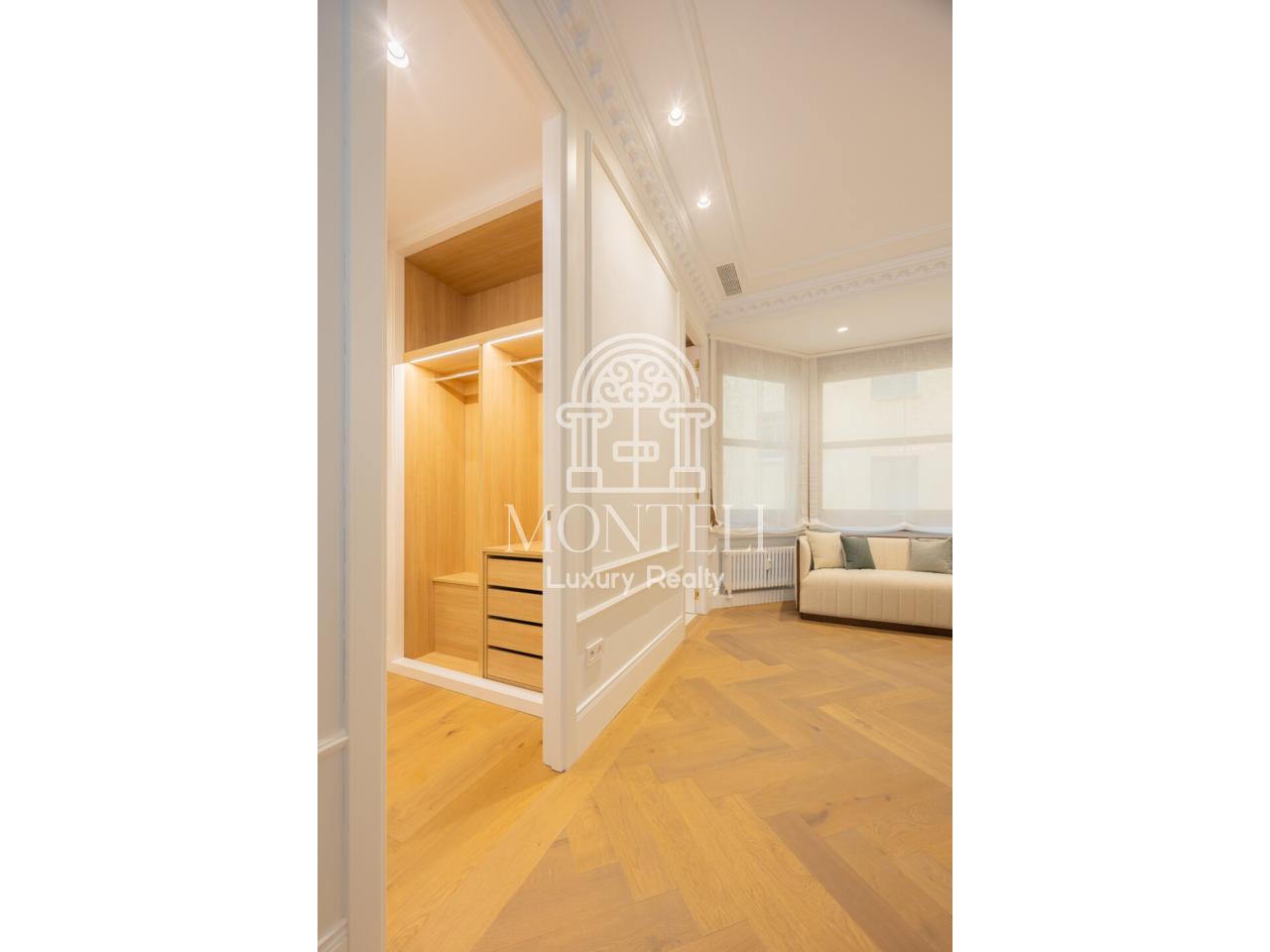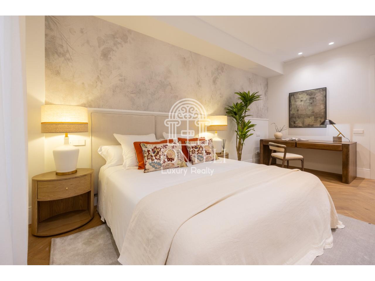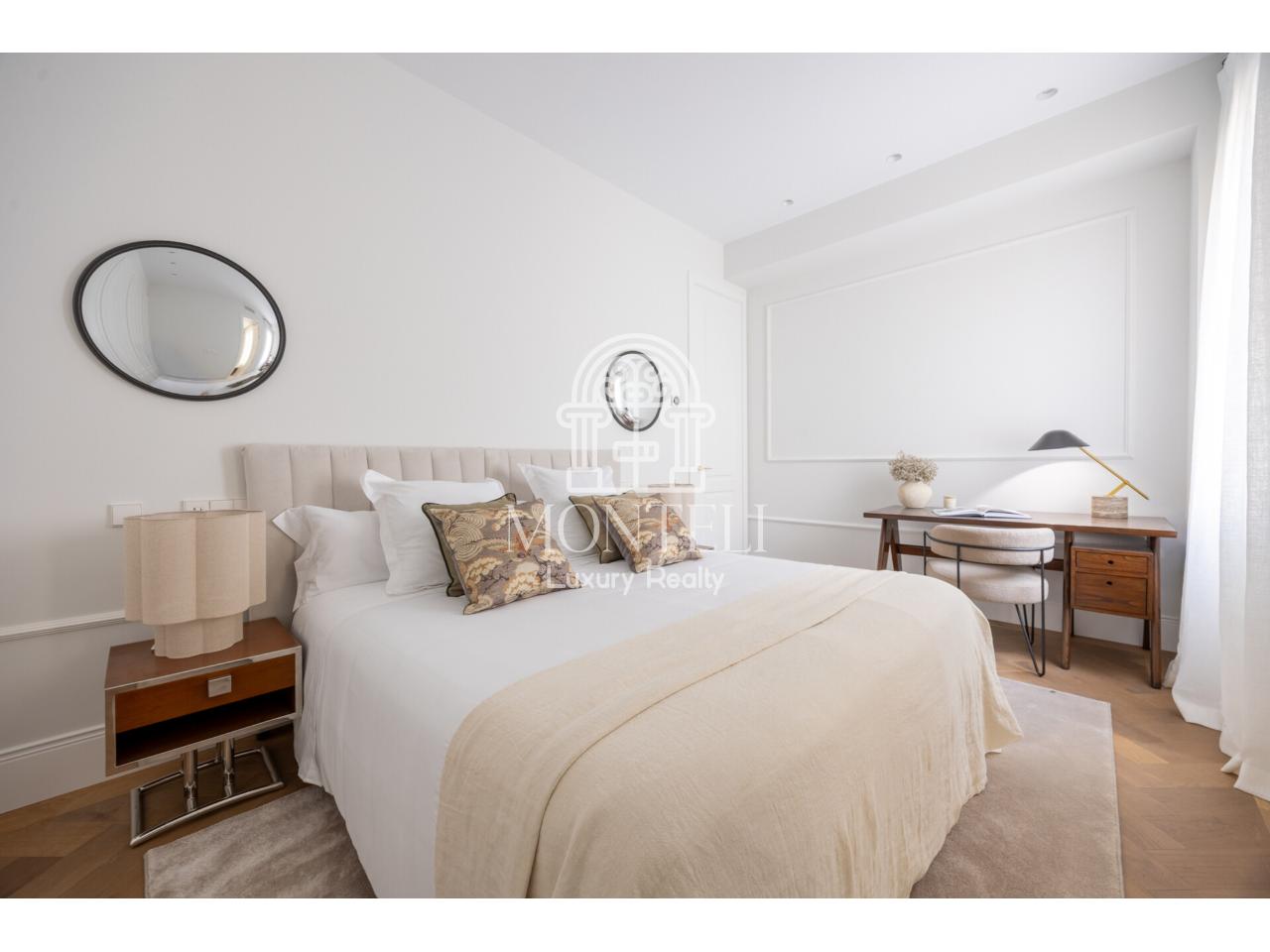 Ubicado en una primera planta con altura de segundo, el piso disfruta de unas espectaculares vistas abiertas a la Embajada de Italia, aportando una extraordinaria sensación de amplitud, luz y privacidad. Integralmente reformado de diseño, cuenta con 451 metros cuadrados distribuidos en tres elegantes zonas de salones, un amplio comedor, cocina semi-integrada y cuatro dormitorios en suite, destacando el principal con dos vestidores y dos baños.