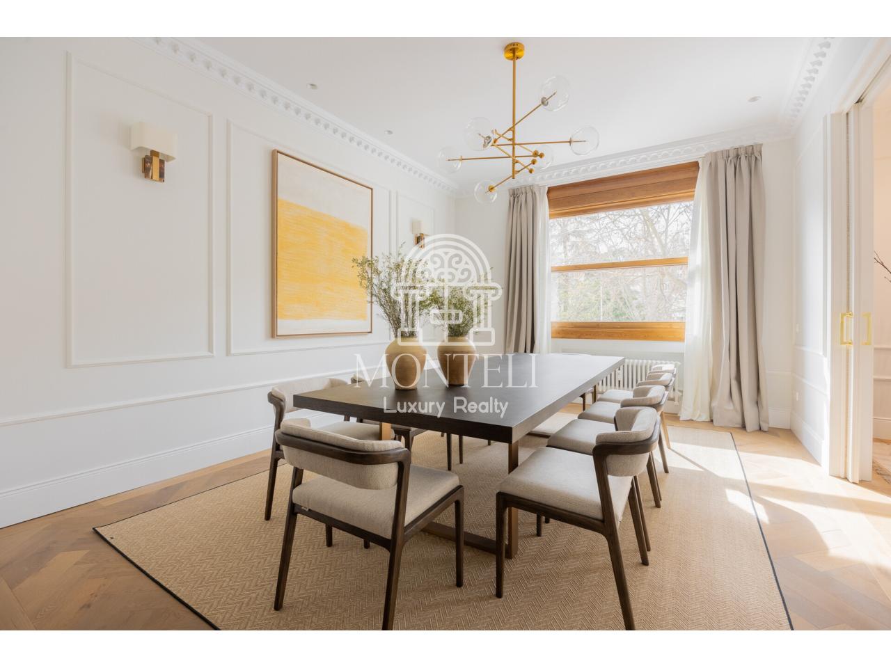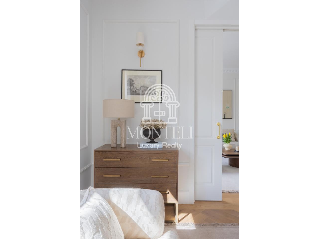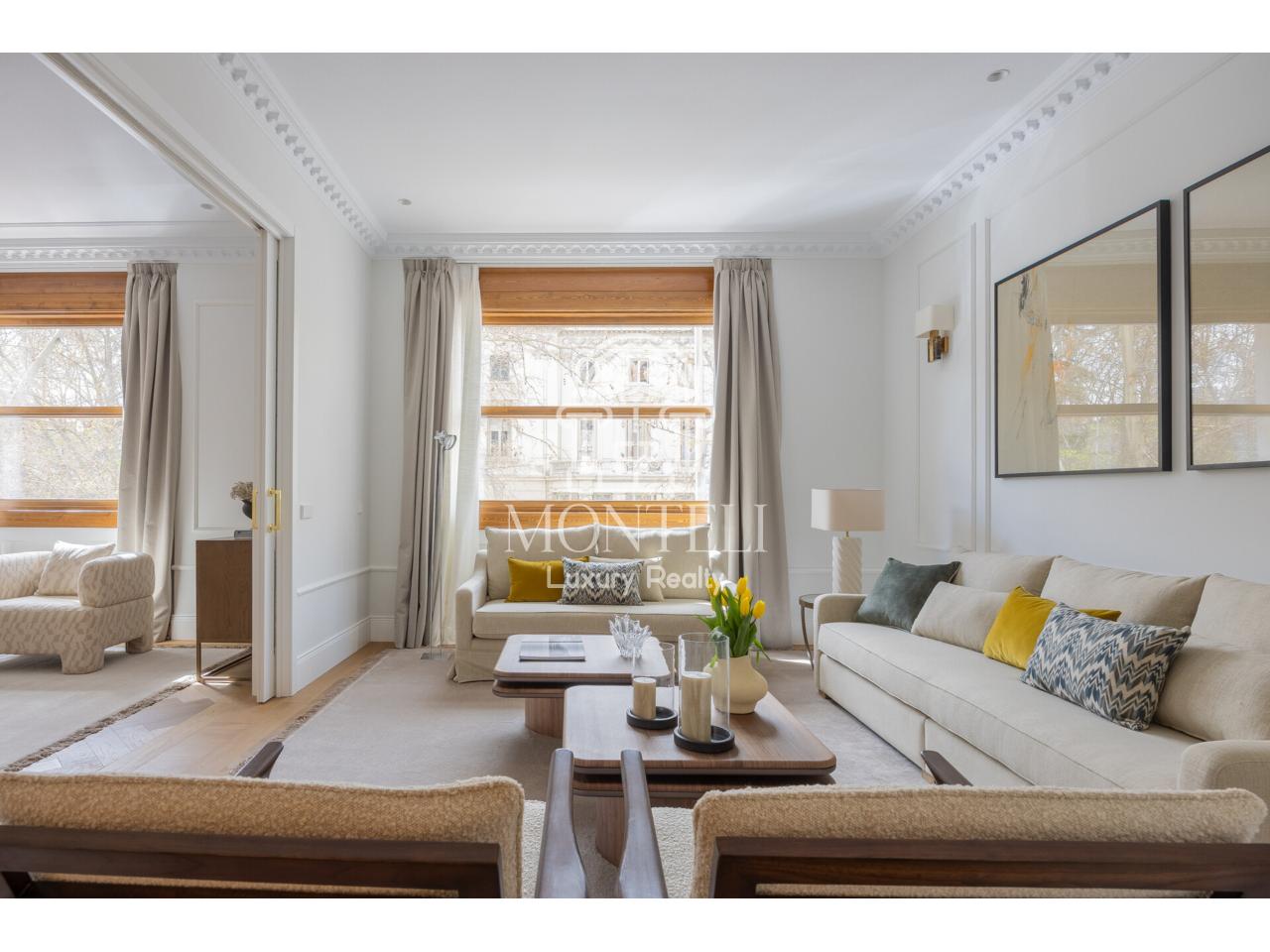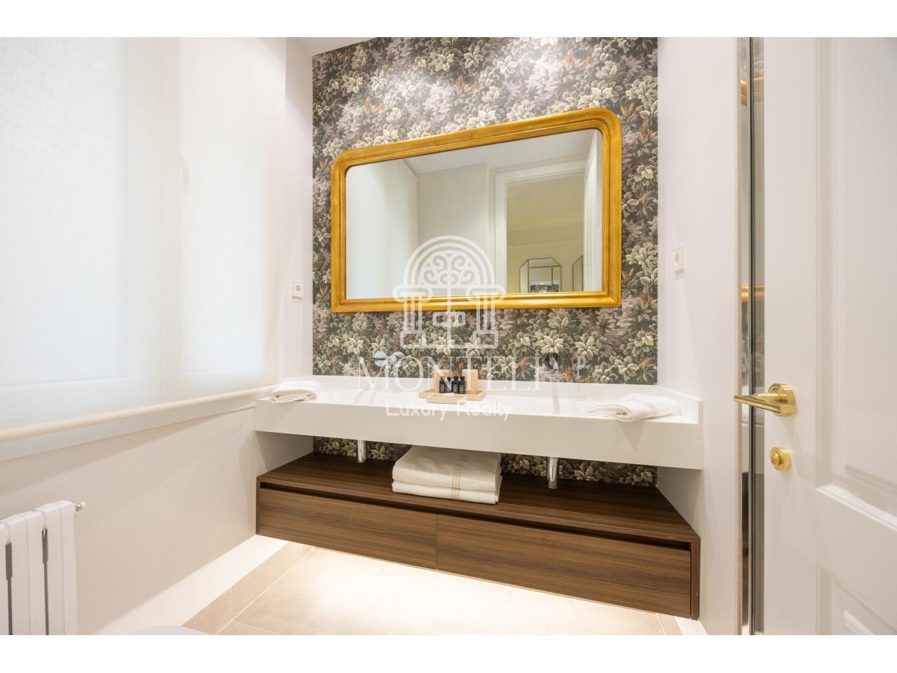 Ubicado en una primera planta con altura de segundo, el piso disfruta de unas espectaculares vistas abiertas a la Embajada de Italia, aportando una extraordinaria sensación de amplitud, luz y privacidad. Integralmente reformado de diseño, cuenta con 451 metros cuadrados distribuidos en tres elegantes zonas de salones, un amplio comedor, cocina semi-integrada y cuatro dormitorios en suite, destacando el principal con dos vestidores y dos baños.